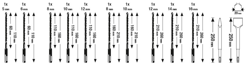 | бури /2x60 мм (Ø 5, 6 мм), 3x110 мм (Ø 8, 10, 12 мм), 2x160 мм (Ø 8, 10 мм), 3x210 мм (Ø 12, 14, 16 мм) |