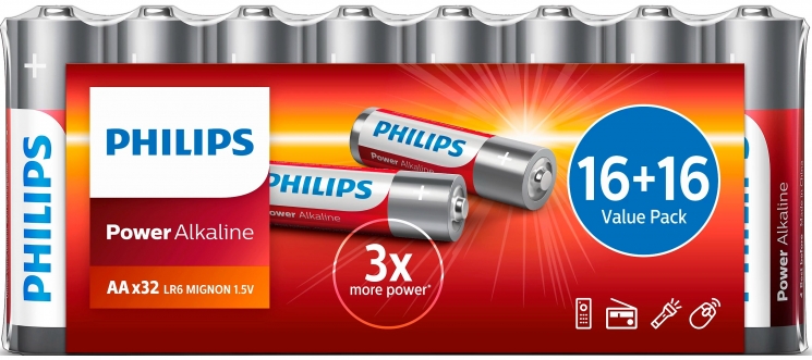 Опис Батарейка Philips Power Alkaline AA лужна. плівка, 32 шт