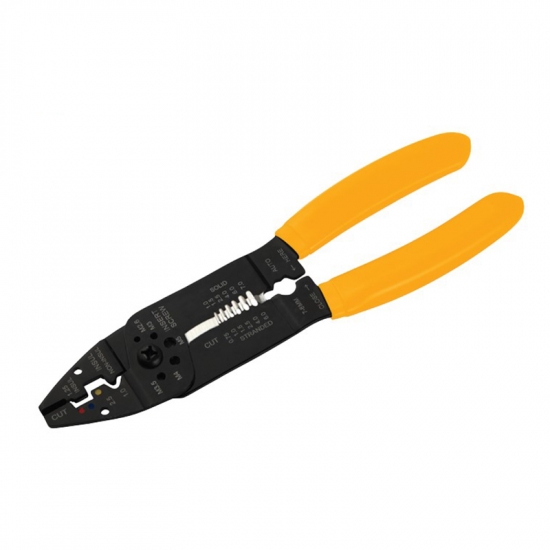 Мультифункціональний діелектричний інструмент Tolsen Профі — це універсальний інструмент для електромонтажних робіт, який поєднує функції знімача ізоляції, кусачок і кліщів для обтискання. Він призначений для використання з мідними дротами й штифтами розміром М2.6–М5 та підходить для обтискання клем у побутових і професійних умовах.