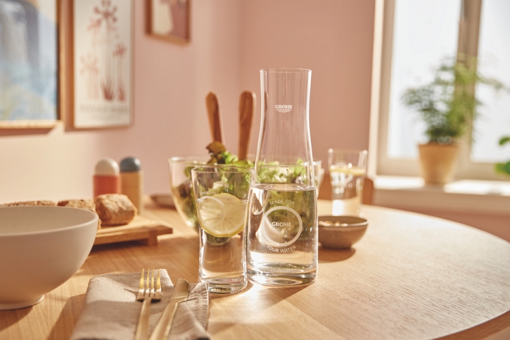 Скляний графин GROHE Blue 40405001 об'ємом 1 літр виготовлений із кришталевого скла з декором GROHE Blue. У комплекті — кришка з нержавіючої сталі з відкидним замком і вбудованим ситом для затримки фруктів чи льоду, а також пластикова кришка. Без BPA, придатний для миття в посудомийній машині.