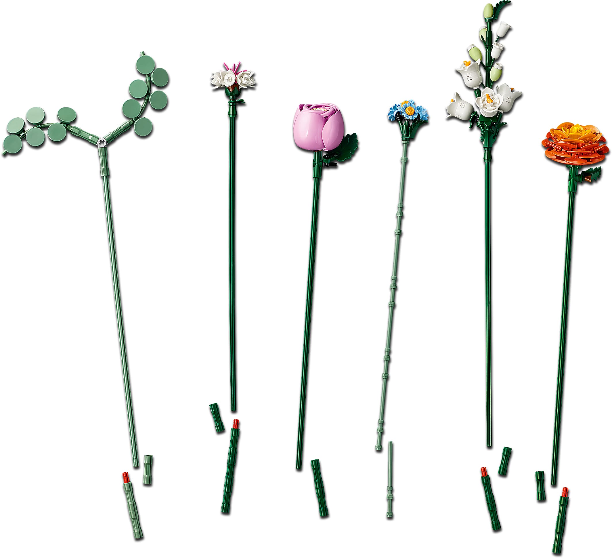 LEGO-квіти – У наборі 15 зібраних квіткових стебел, серед яких ромашки, волошки, евкаліпт, бузина, троянди, жовтець, орхідеї цимбідіум, дзвіночок і жоржина