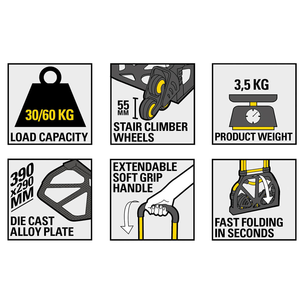 Вантажний візок Stanley SXWT-FT584 — ідеальний інструмент для перевезення коробок, побутової техніки чи інших важких предметів у квартирі, офісі, гаражі або під час переїздів. Візок має міцну алюмінієву конструкцію, яка витримує до 60 кг вантажу, при цьому власна вага всього 3.5 кг.
