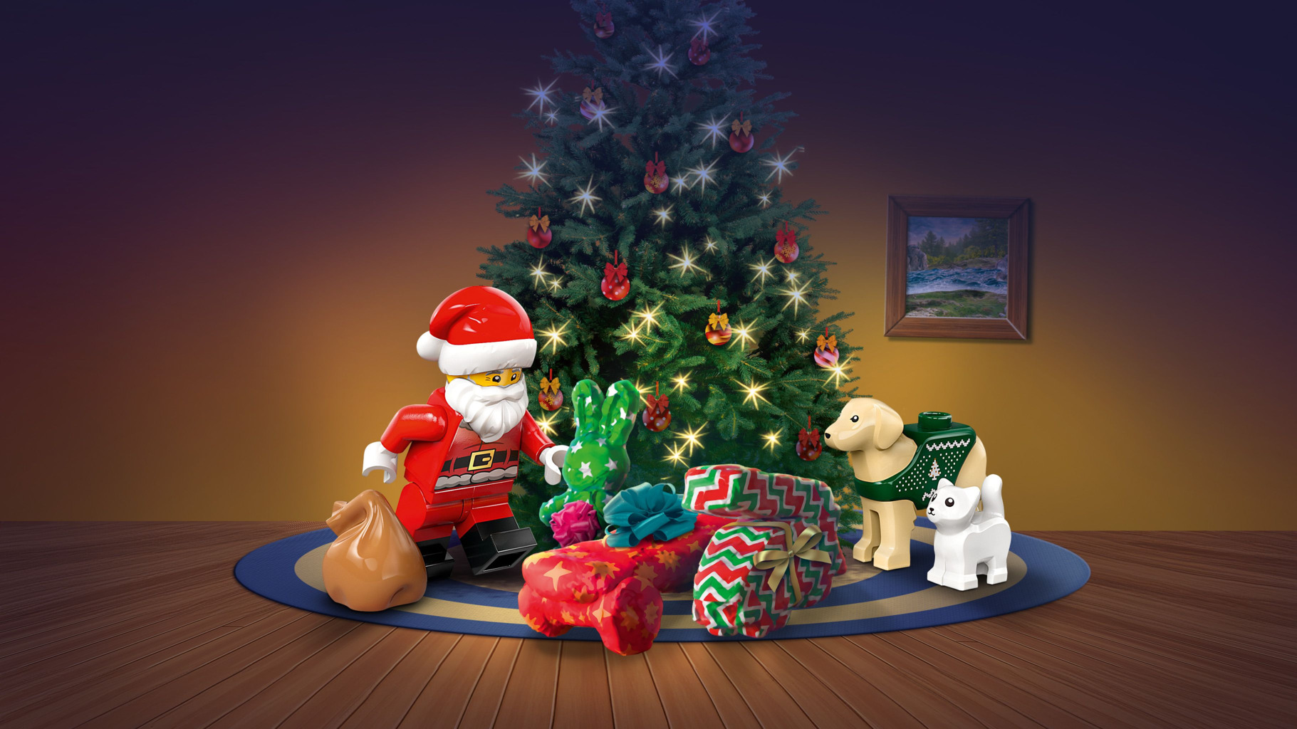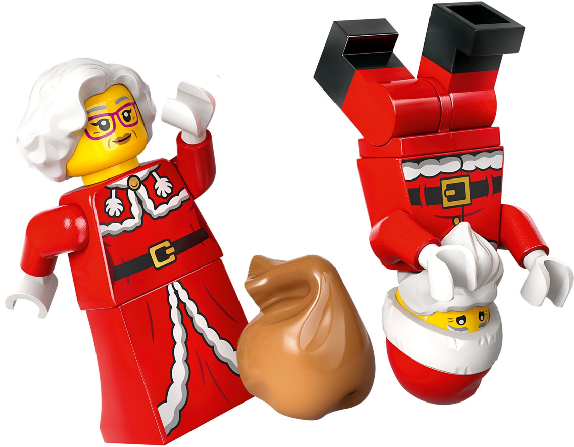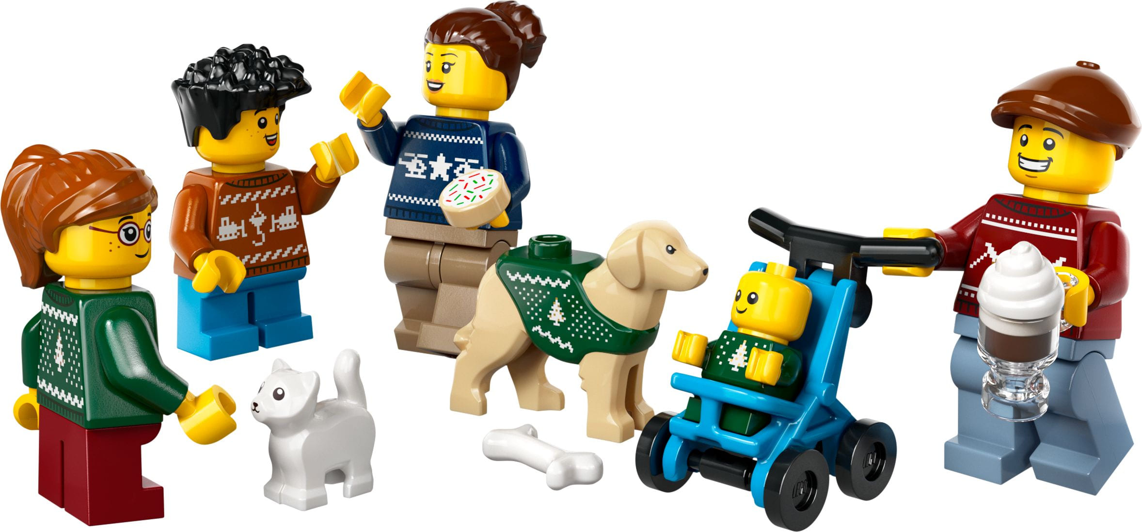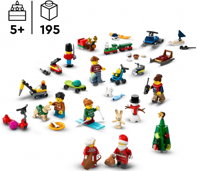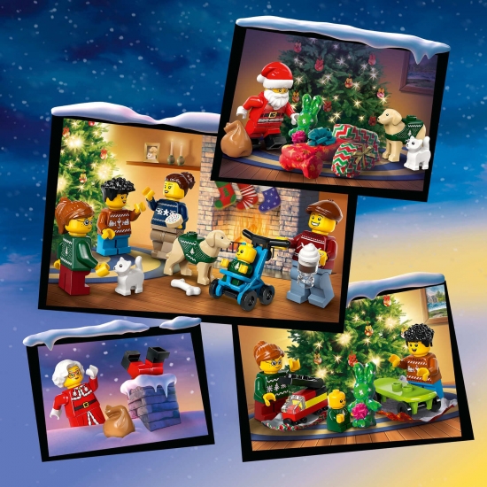 24 святкові сюрпризи – У наборі мініфігурки Санти й місіс Клаус, персонажі у різдвяних светрах, фігурка песика, міні-збірки та святкові аксесуари