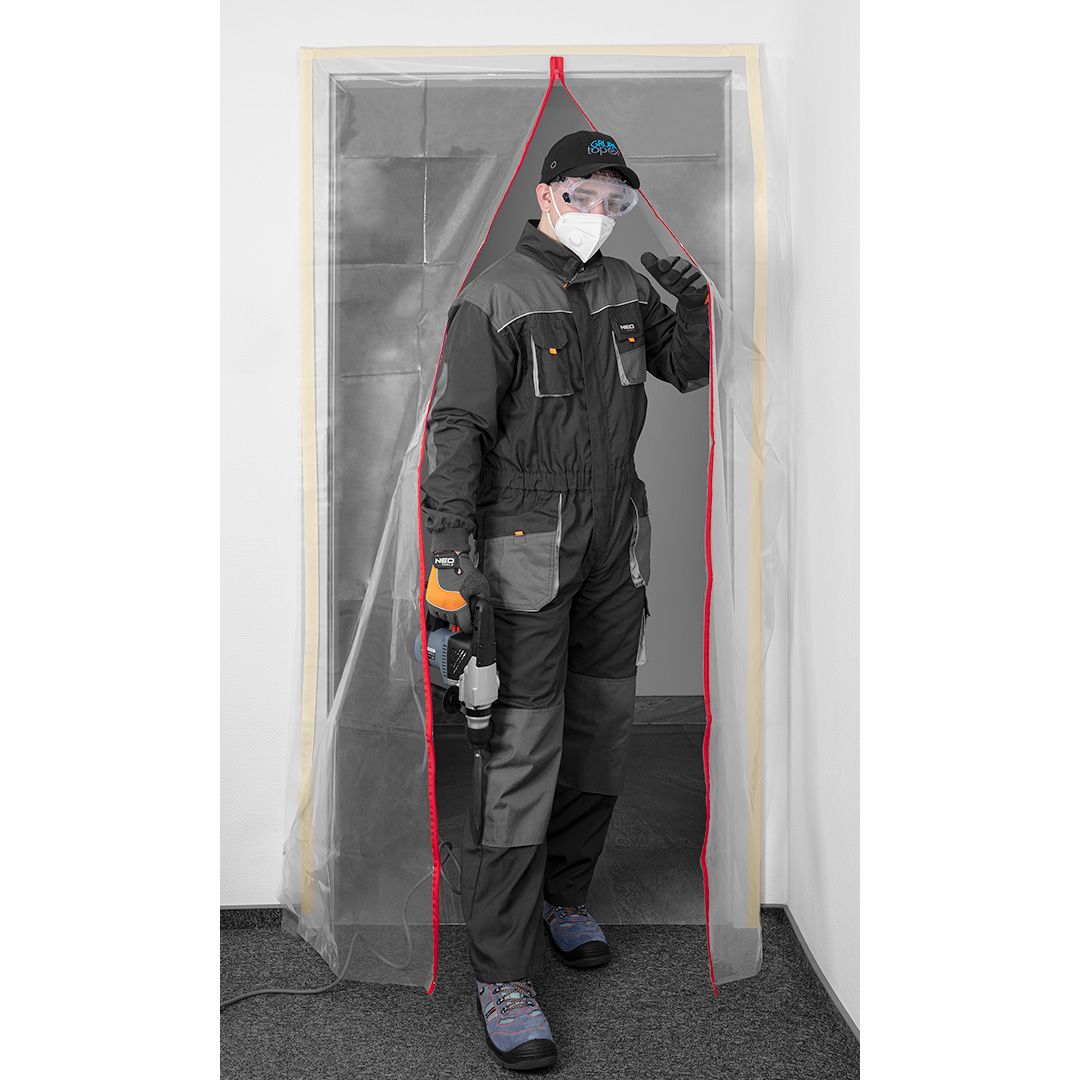 Пилозахисна шторка NEO 49-800 з блискавкою типу "L" призначена для захисту дверних отворів під час ремонтних робіт. Виготовлена з прозорої поліетиленової плівки, розміром 1230×2240 мм. Кріпиться за допомогою двосторонньої стрічки. Відсутність порогу забезпечує зручний прохід із візком. Багаторазова, надійно захищає приміщення від пилу.