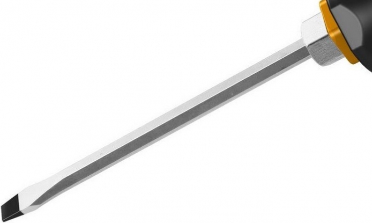 Tolsen SL6.5x100 мм — це міцна ударна плоска викрутка, розроблена для виконання важких монтажних робіт. Виготовлена зі сталі CrV, має посилене жало та надійний металевий ковпачок для ударних навантажень, а також ергономічну ручку для комфортного утримання.