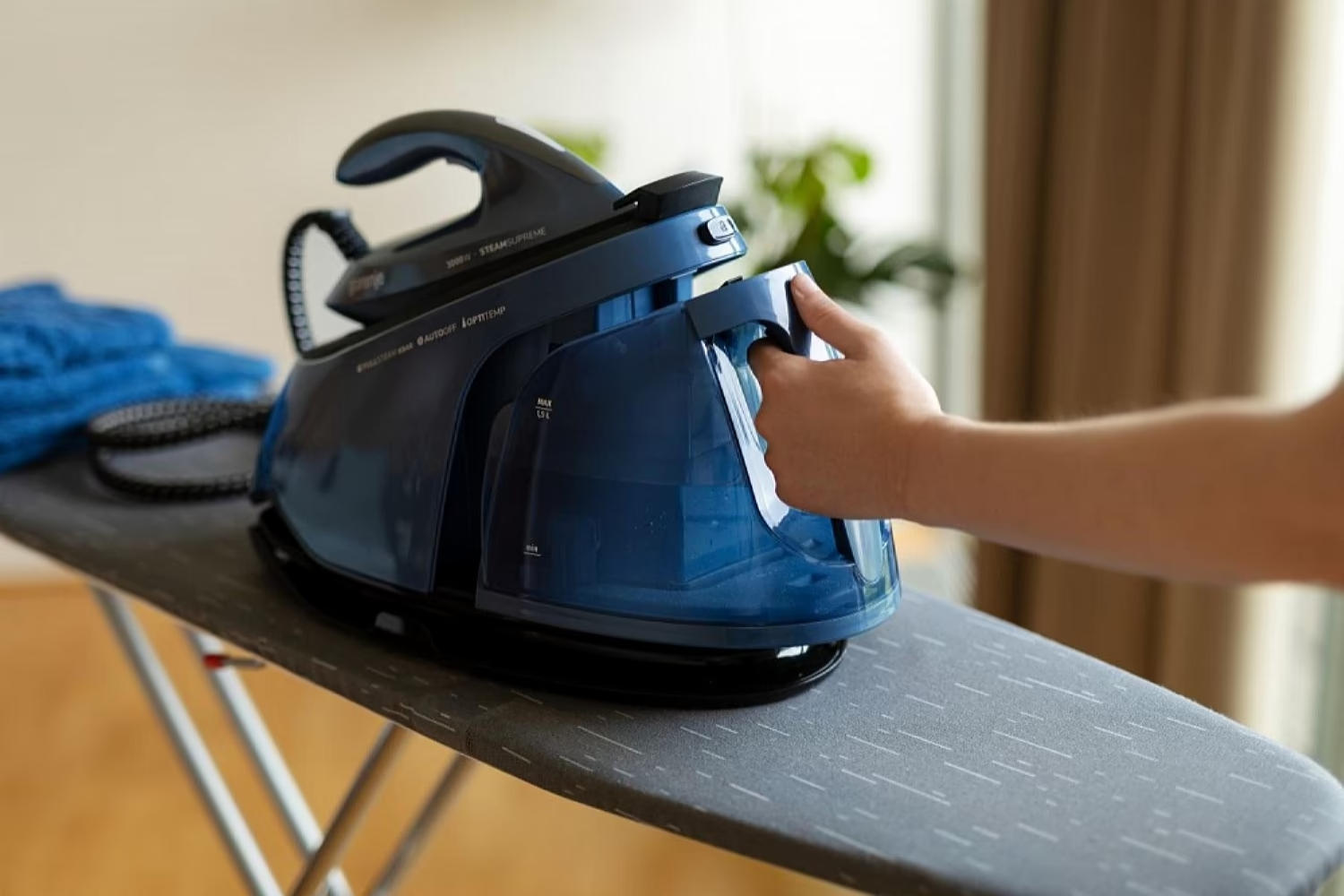 Прасувальна станція призначена для ефективного прасування великих обсягів білизни. Проте вона легка, і ви зможете легко її транспортувати та зберігати. Зафіксуйте праску на станції та зберігайте обидва шнури в отворі під нею.