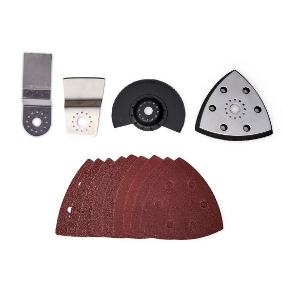В комплект поставки входять дельта-шліфувальний башмак із кріпленням на липучці та набір шліфувального паперу 9 шт різної зернистості (кожен 3x P60, P80, P120). Також в комплект поставки входять скребок, порізне пильне полотно для деревини та пластику та сегментне пиляльне полотно для дерева, пластику та м’якого металу (HSS). Поставляється без акумулятора і зарядного пристрою, вони доступні окремо.