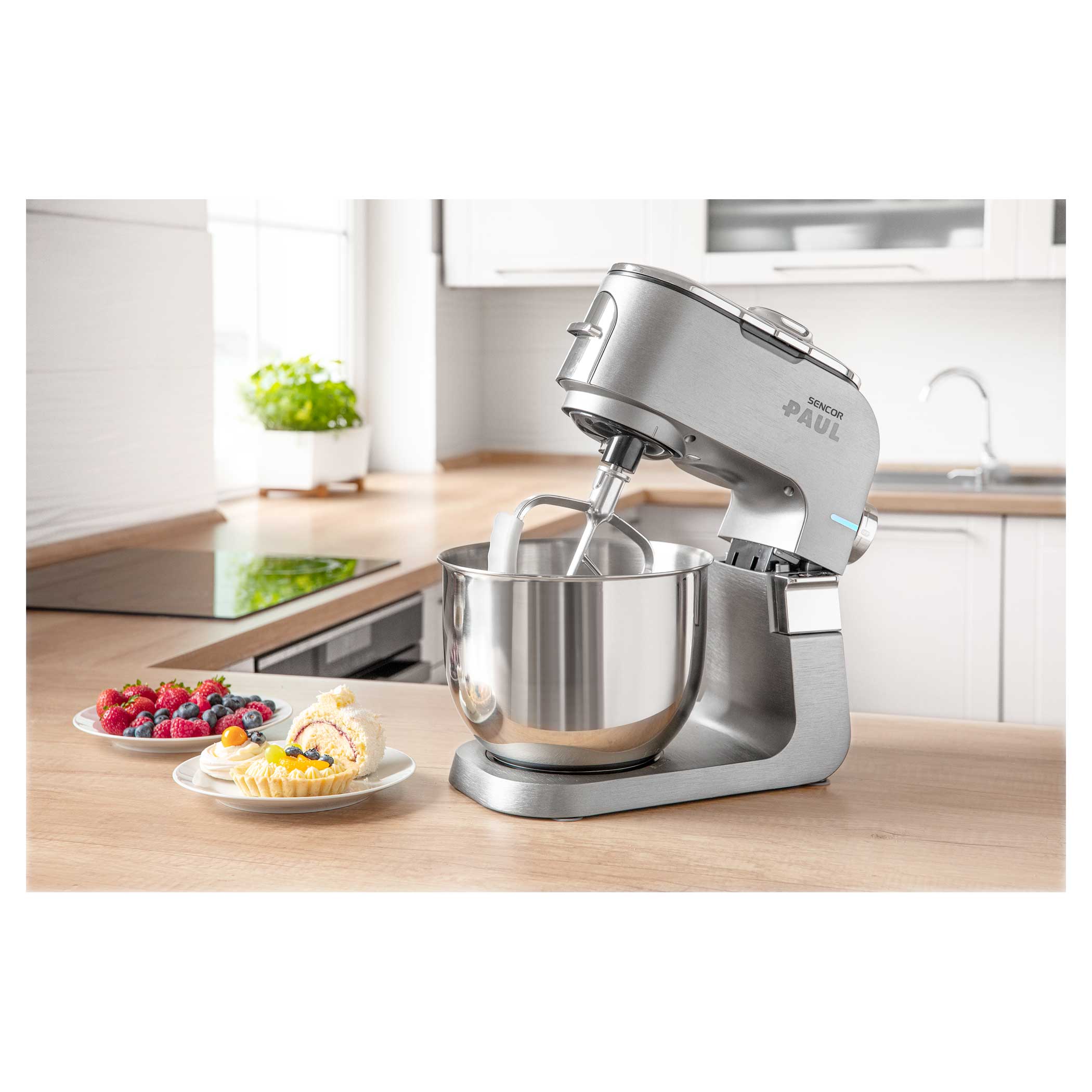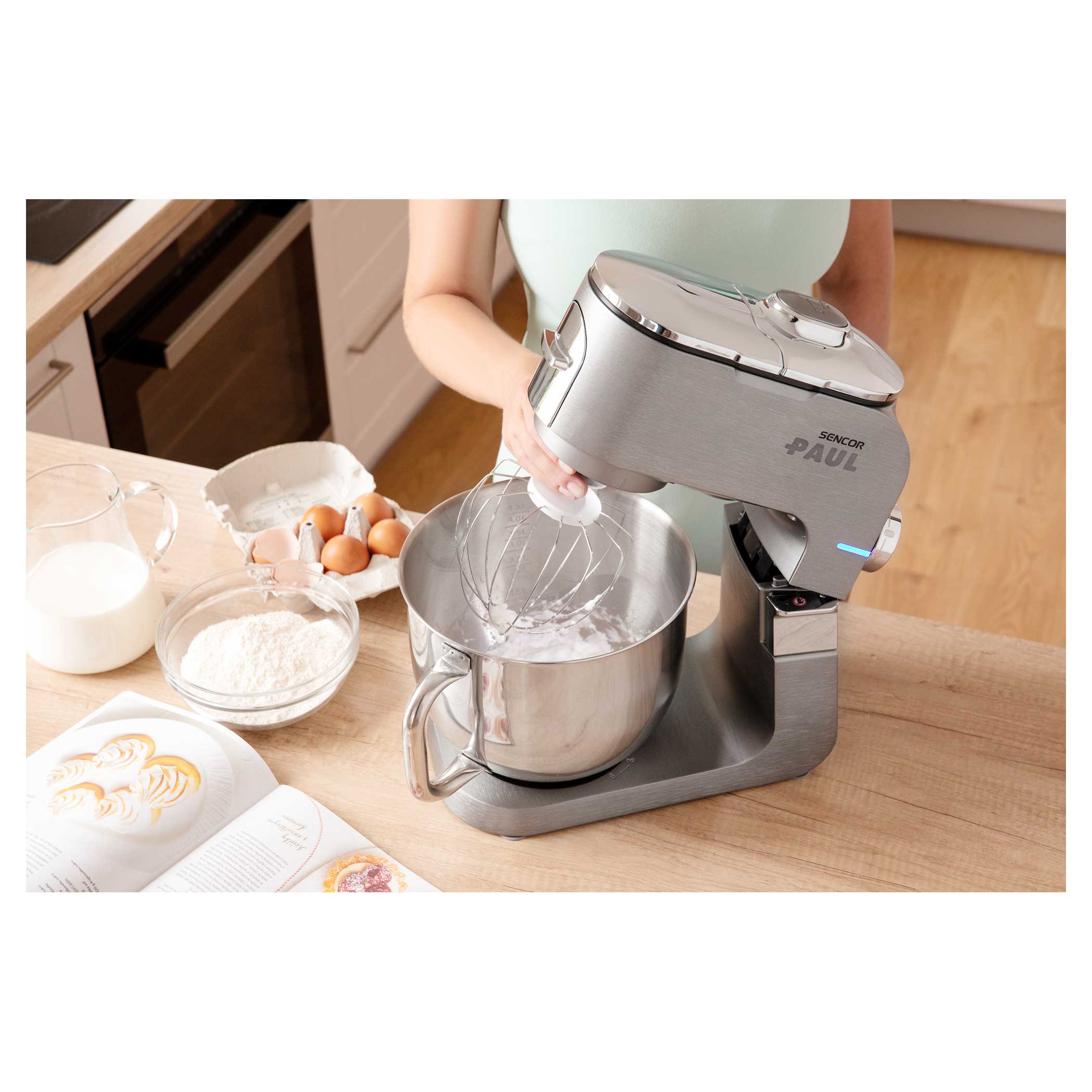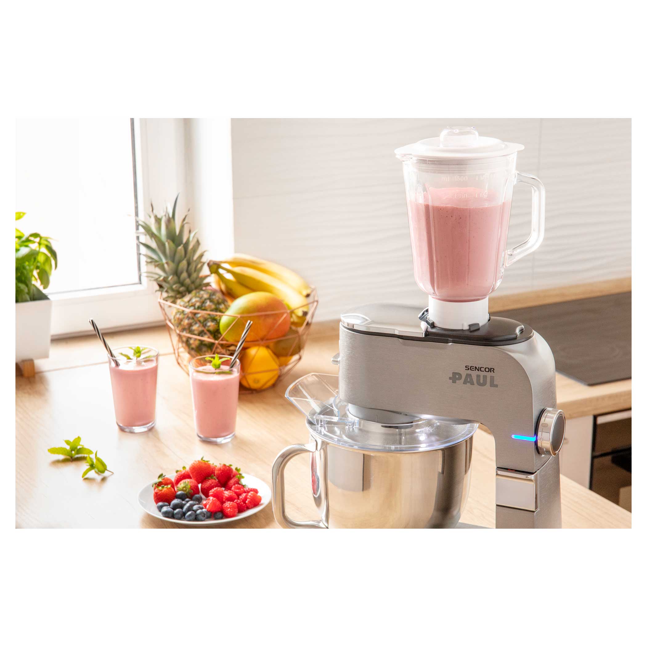 Sencor Paul 1 STM7950 — високоякісна кухонна машина з потужним двигуном 1700 Вт та повністю металевим корпусом. Оснащена двома чашами з нержавіючої сталі: на 3,5 л та 6,5 л із ручкою та мірною шкалою. До комплекту входить скляний блендер (1,5 л), м’ясорубка з решітками для грубого та дрібного помелу, 3 основні насадки (для замішування, збивання, легкого тіста), гнучкий вінчик FLEXI, насадка для начинки ковбас, форма для печива, захист від бризок та кришка для зберігання.