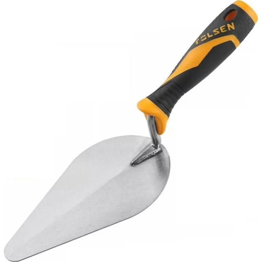 Кельма Tolsen довжиною 130 мм призначена для точних оздоблювальних і кладочних робіт. Завдяки своїй краплеподібній формі вона зручна для нанесення розчинів у важкодоступних місцях або при дрібних роботах. Лезо товщиною 1.2 мм забезпечує надійність і довговічність, а гумове руків'я гарантує зручність навіть під час тривалої роботи.