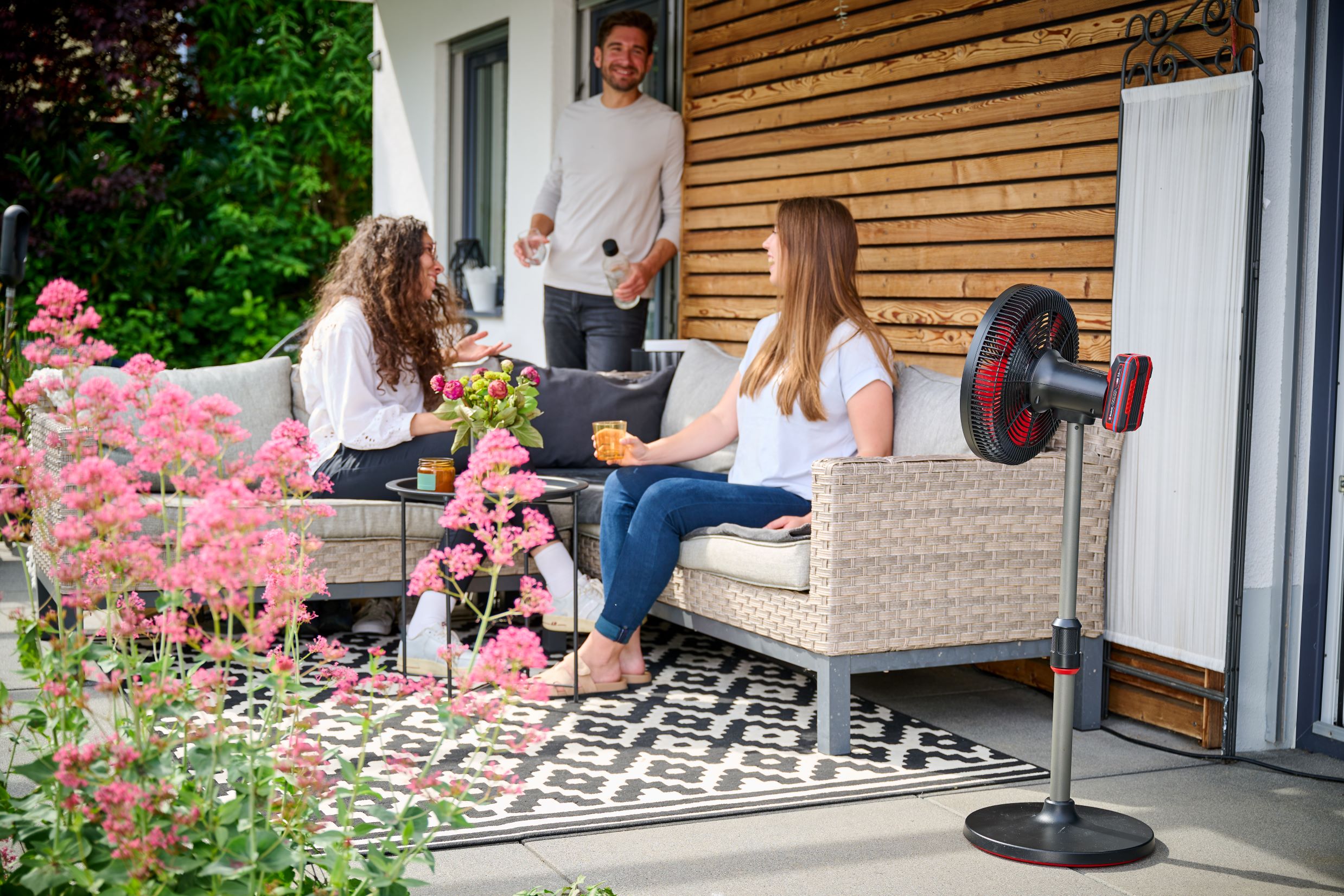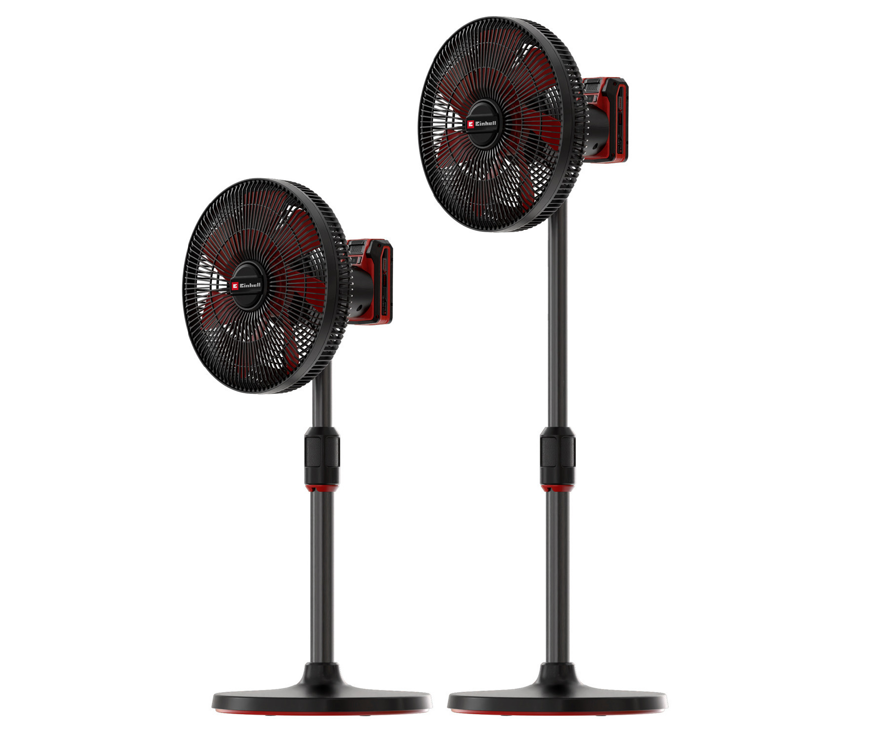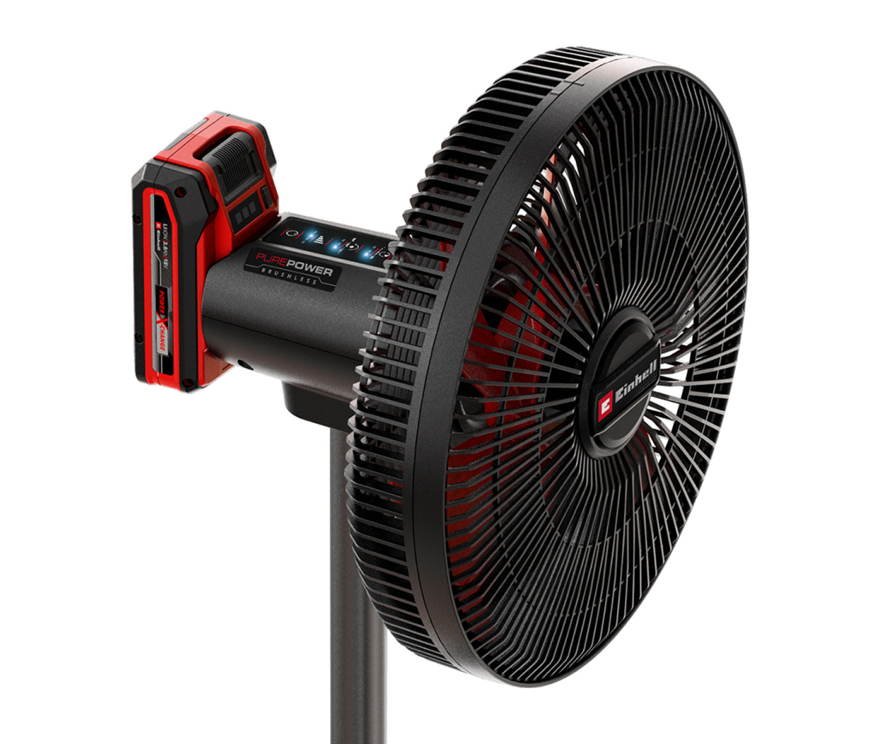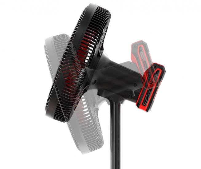 Тиха робота забезпечується 4-ступінчастим регулюванням потоку повітря: тривалий час роботи для тихої роботи вночі або максимальний потік повітря зі швидкістю 15 км/год. Прохолодний вітерець створюється колесом вентилятора діаметром 320 мм. Головку вентилятора можна поступово нахиляти вперед і назад, доки не буде досягнуто потрібного положення. Крім того, вентилятор, що працює від акумулятора, оснащений функцією коливання. Головка вентилятора автоматично повертається в діапазоні від -60° до +60°. Міцна підставка з телескопічною ручкою забезпечує стабільний стан. Висоту можна плавно регулювати від 42,5 см до 72,5 см. Потужні акумулятори Power X-Change забезпечують дуже тривалий час роботи. Наприклад, вентилятор на підставці працює до 43 годин з акумулятором ємністю 5,2 Аг. Через 1–8 годин вентилятор на акумуляторі автоматично вимикається завдяки функції таймера. Акумуляторний вентилятор постачається без акумулятора та зарядного пристрою.