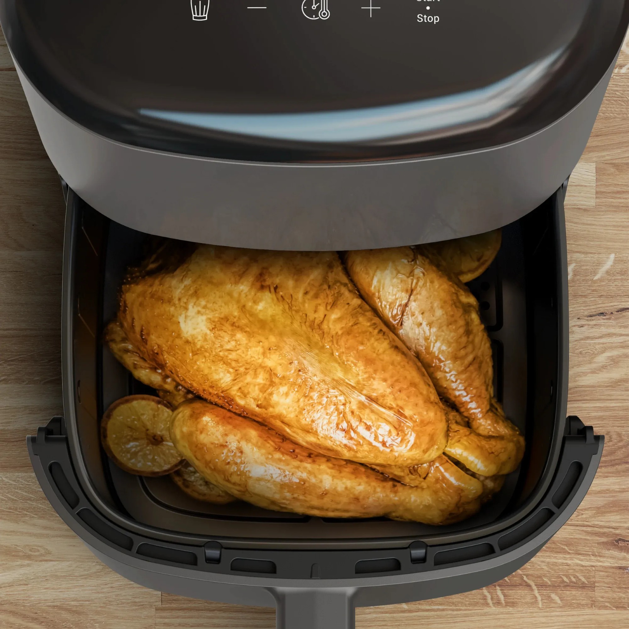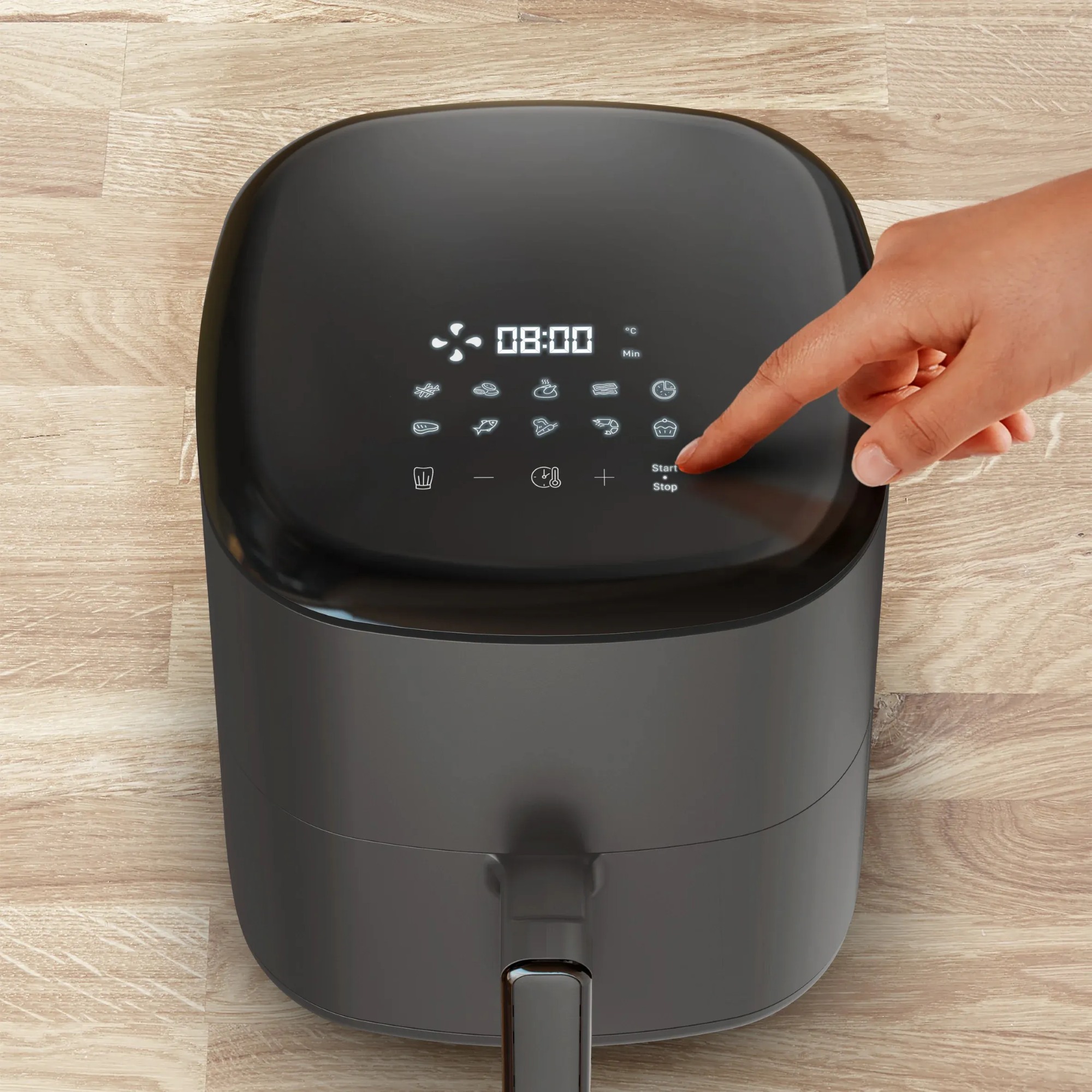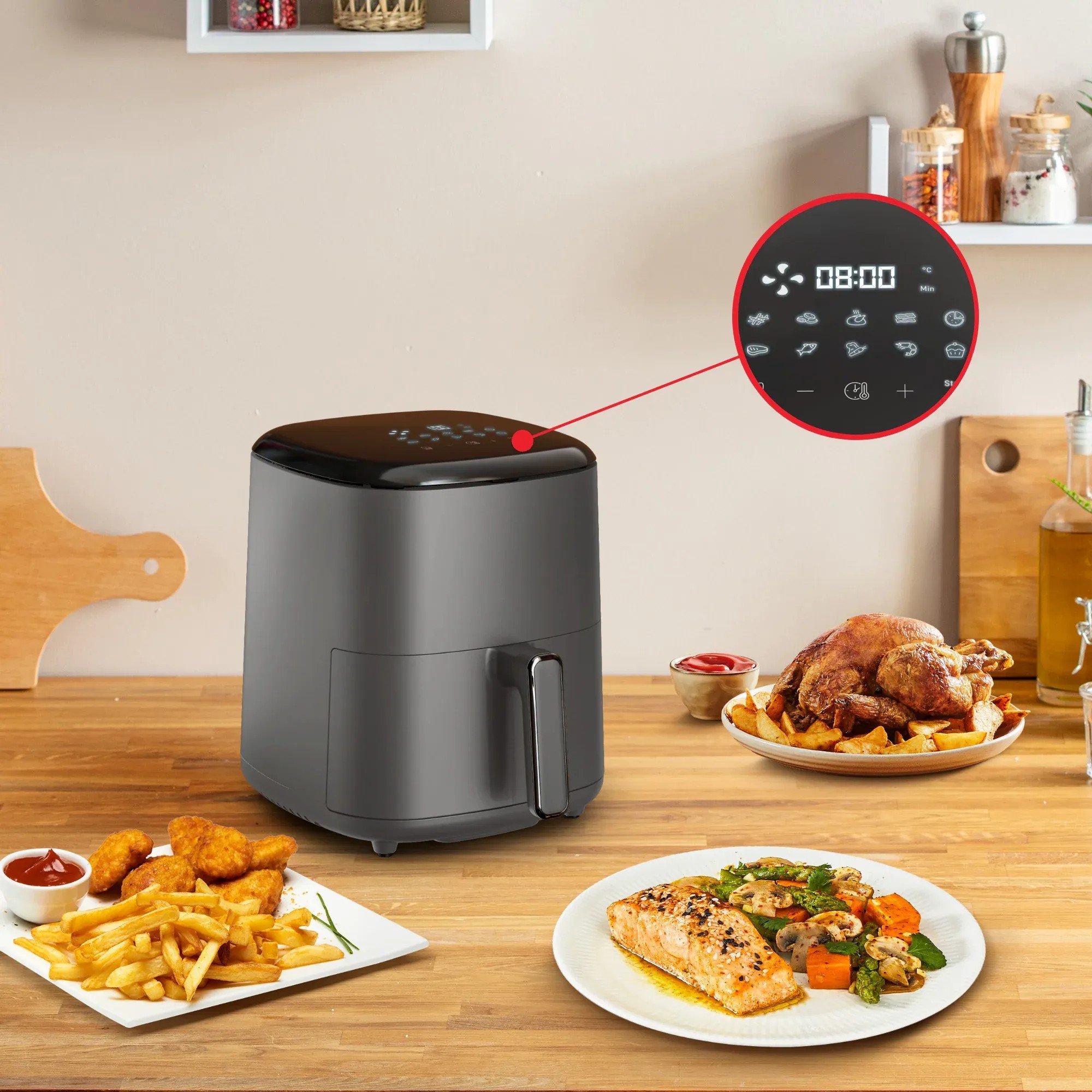 10 автоматичних програм приготування: картопля фрі, курка, стейк, риба, десерт, піца, нагетси, овочі, креветки та бекон.