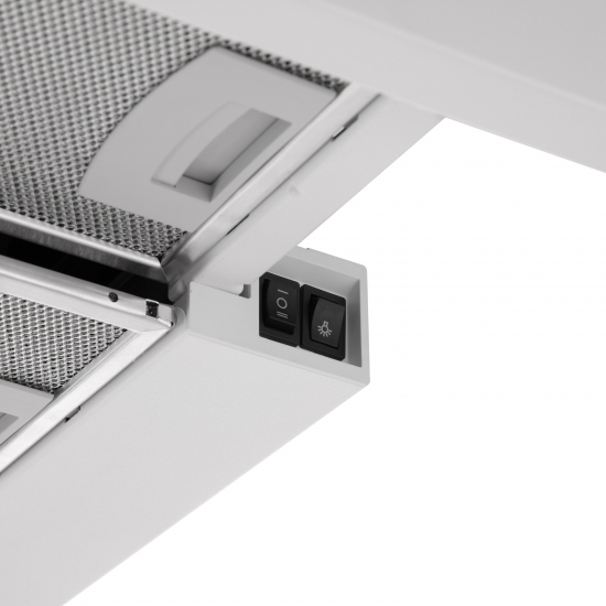 Два тришарові алюмінієві фільтри вловлюють жир і часточки, захищаючи кухонні поверхні. Заслінка запобігає зворотному потоку повітря, а рівень шуму до 59 дБ гарантує комфортну роботу. Дві LED-лампи потужністю 1 Вт кожна достатньо освітлюють варильну поверхню навіть за слабкого основного світла.