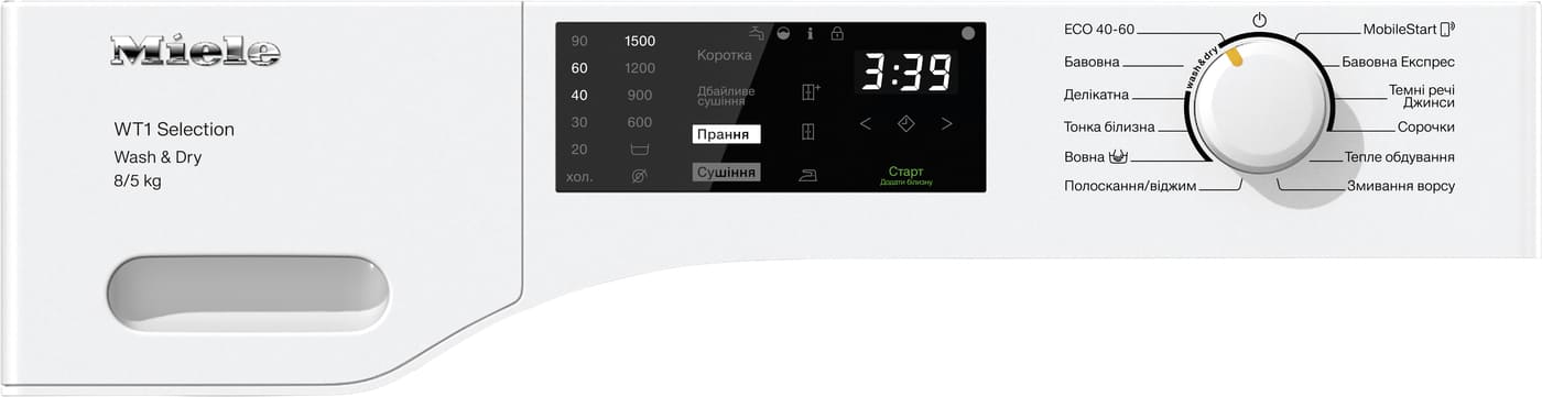Сенсорний дисплей дозволяє легко обрати потрібну програму або налаштувати режим під свій тип тканини. Модель підтримує підключення до Miele@Home через Wi-Fi, що дозволяє дистанційно запускати, зупиняти або перевіряти стан циклу зі смартфона.