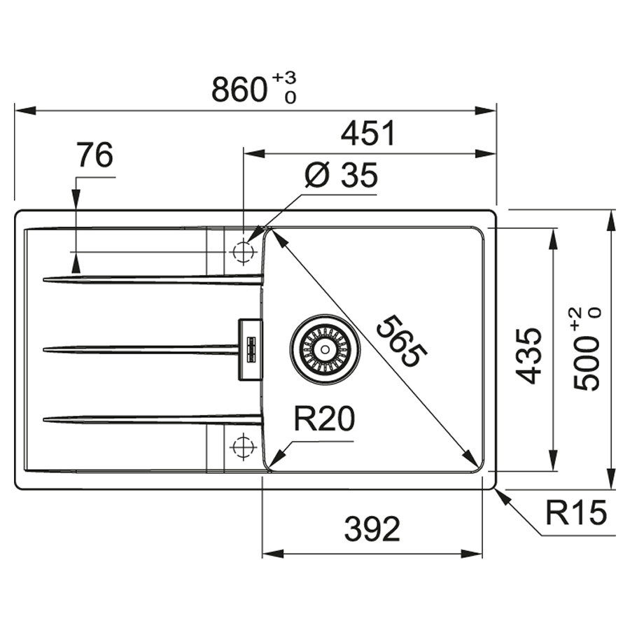 Отвори під змішувач та дозатор для рідкого мила попередньо підфрезеровані. Збільшена кількість можливих отворів дає можливість встановити на мийку додаткові аксесуари, такі як дозатор мийних засобів, краник під фільтровану воду, кнопку вмикання подрібнювача харчових відходів тощо.