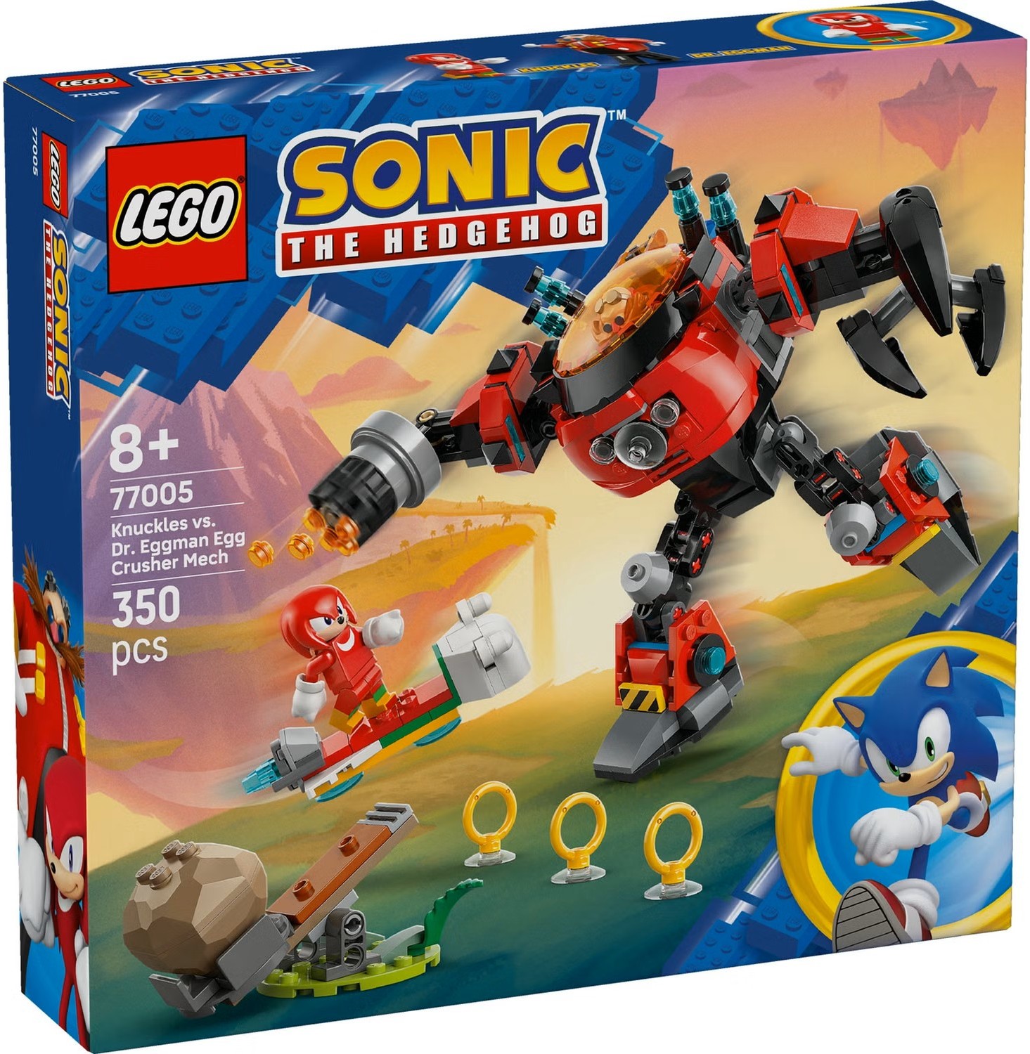 Цей подарунок для геймерів містить практичного рухомого іграшкового робота з кабіною, що відкривається, обертовою пусковою установкою з 6 шипами, масивною клешнею, що обертається, і шарнірними кінцівками для інтерактивної гри. 2 персонажі, Knuckles the Echidna і Dr. Eggman, готові до сюжетних ігор, крім того, у набір входить говерборд, іграшкова катапульта з 2 валунами, 3 золотими кільцями й 2 смарагдами хаосу. Усі малюки, які обожнюють активні ігри, пишатимуться тим, що мають цю іграшку.