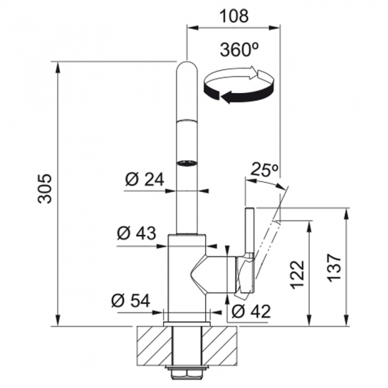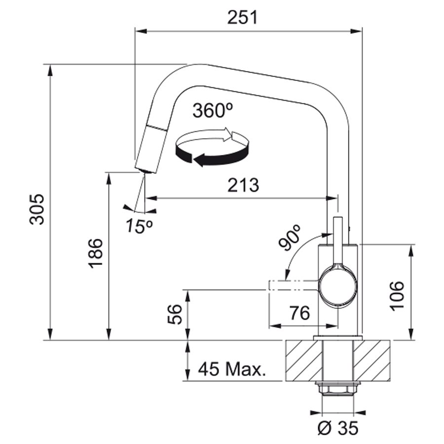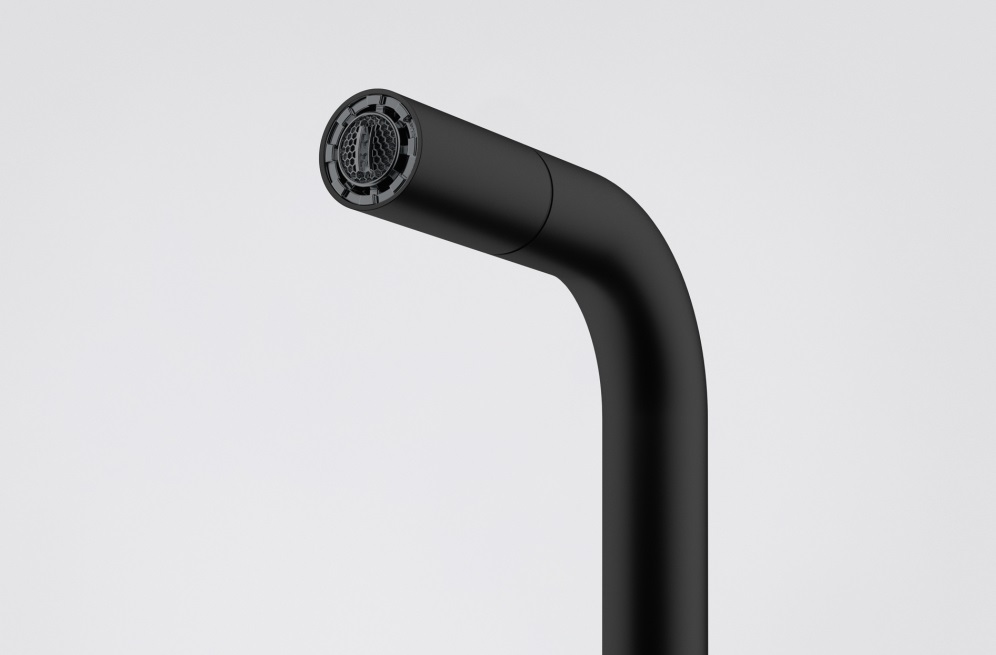Кухонний змішувач з поворотним невитяжним виливом і бічним важелем керування. Витяжний вилив дозволяє зручно мити всю поверхню мийки та наповнювати посуд, який розміщений поза її межами. Важіль відкривається вперед на кут 90°, тому можна здійснювати монтаж впритул до стіни. Кут повороту виливу складає, 360° тому водяний потік досягає більшої площі мийки, а також такий змішувач можна монтувати в острівні кухні. Аератор насичує водяний потік повітрям, завдяки чому краще працюють миючі засоби а також економиться вода.
