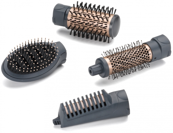 Фен-щітка Babyliss Style Pro 4-в-1 з потужністю 1000 Вт, іонізацією та 4 насадками: обертальна щітка Ø50 мм, кругла керамічна Ø38 мм, насадка для випрямлення та розгладжувальна щітка. Два рівні температури, холодне повітря, обертальний шнур 2,2 м і чохол у комплекті.
