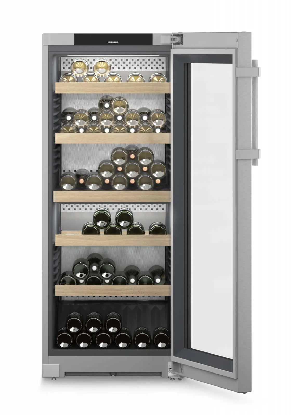 Максимальна місткість. Кліматична винна шафа Liebherr також полегшує розміщення колекції вин, що постійно поповнюється. Щоб сповна використовувати її місткість, камеру створено так, щоб пляшки можна було розташовувати на дерев’яних полицях шийками одна до одної. Це створює багато місця для винних запасів, навіть якщо вони регулярно поповнюються. Тож сміливо розширюйте свою колекцію.