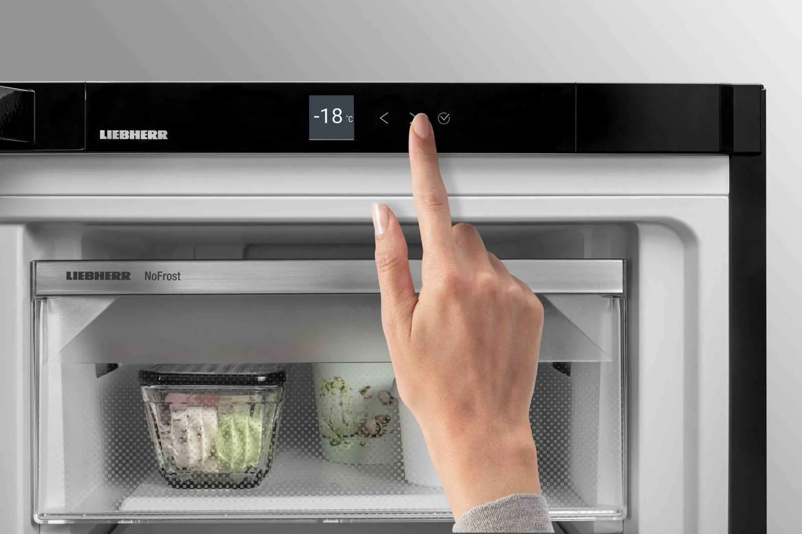 Перевірити поточну температуру, вибрати потрібний режим роботи чи налаштувати функції вашого пристрою Liebherr можна всього лише одним дотиком. Дисплей з інтуїтивно зрозумілим інтерфейсом у поєднанні з сенсорною панеллю забезпечує максимальний комфорт у керуванні морозильною технікою.