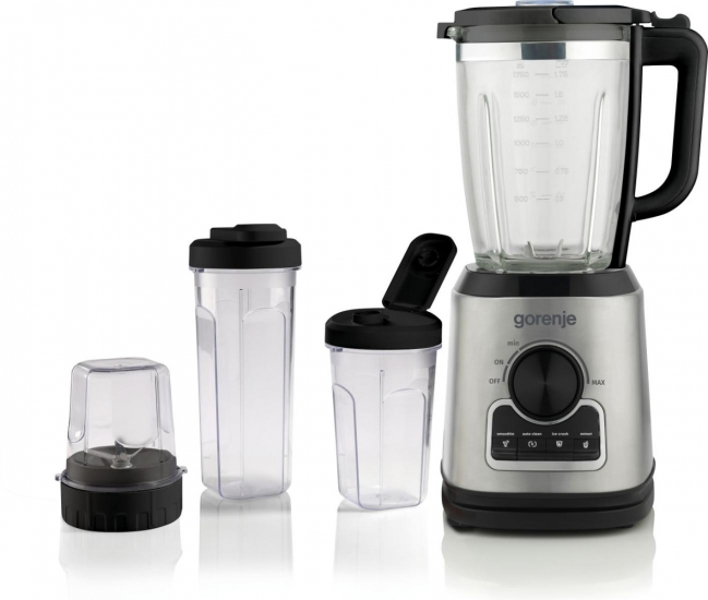 Блендер Gorenje стаціонарний 1400Вт, чаша-1750мл, додаткові ємкості, кавомолка, кришення льоду, приготування супу, імпульсний режим, метал