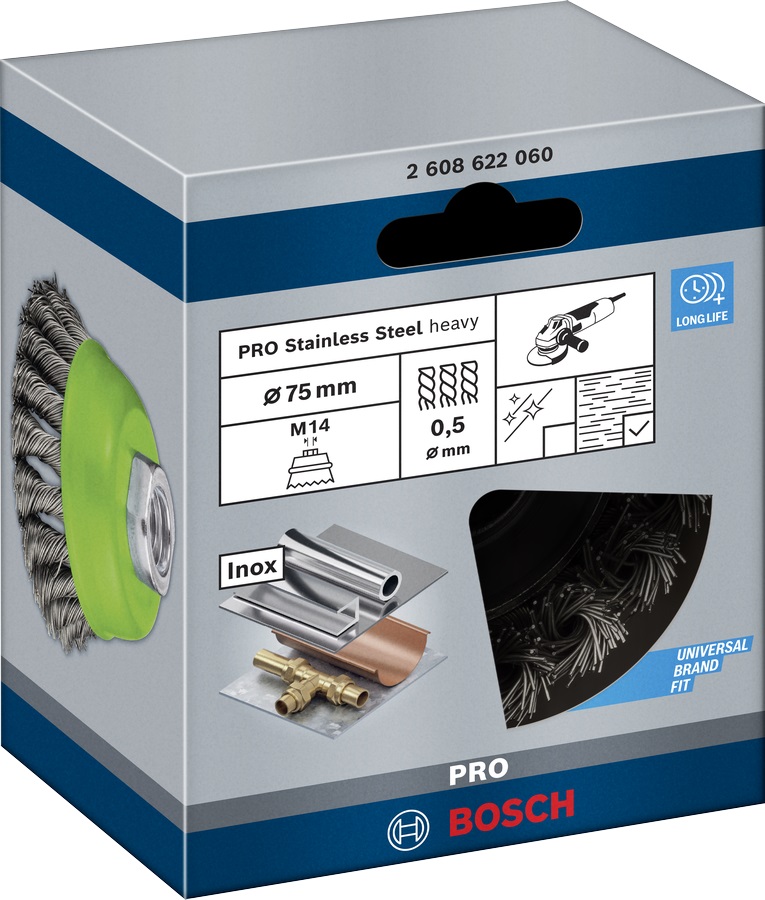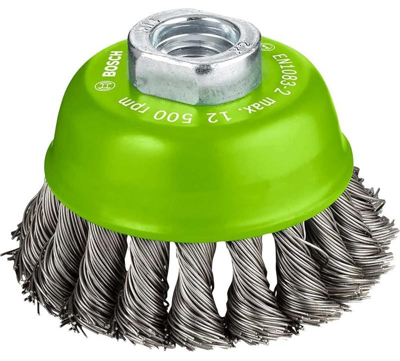 Чашкова щітка Bosch Professional з нержавіючої сталі забезпечує ефективне очищення металів, включно з кольоровими сплавами, алюмінієм або нержавіючою сталлю. Завдяки гофрованому дроту товщиною 0.5 мм та діаметру 75 мм, вона забезпечує м’яке, але результативне очищення. Різьбове з’єднання M14 робить щітку сумісною з більшістю кутових шліфмашин. Ідеальна для робіт, де важливо уникнути подальшого окиснення обробленої поверхні.
