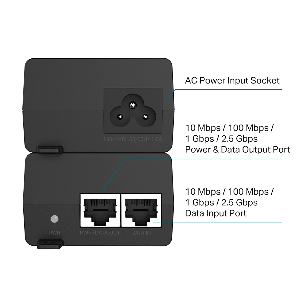 2.5G PoE+ Injector POE260S (TL-POE260S) повністю відповідає стандартам IEEE 802.3af/at і може працювати з усіма PD (активними пристроями) або іншими еквівалентними продуктами, щоб розширити вашу мережу там, де немає лінії живлення або розетки, де ви хочете виправити пристрій, такі як 2.5G ТД, HD IP камера, ІP-телефон, тощо.
