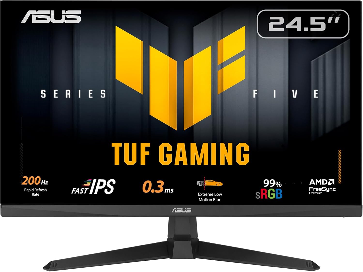 Монітор Asus TUF Gaming VG259Q5A — 24.5″ Full HD з надшвидким оновленням 200 Hz, часом відгуку 0.3 мс (GTG) і підтримкою AdaptiveSync (FreeSync Premium, G‑Sync Compatible). IPS‑матриця з широкими кутами огляду та 99 % sRGB забезпечує яскраві, насичені кольори, а ELMB Sync дозволяє уникнути розмиття в динамічних сценах.
