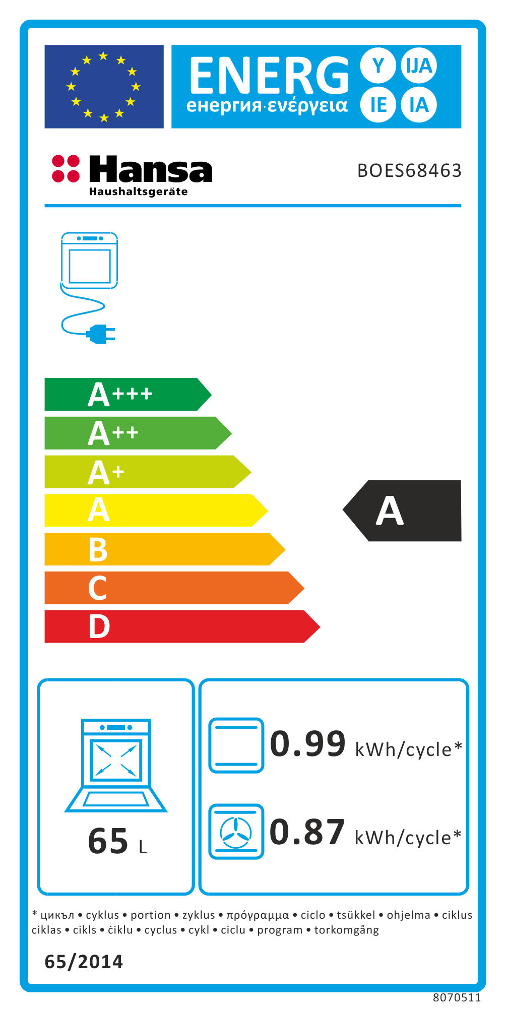 Духовка электр. Hansa, 60см, 65л, A, гриль, емаль легкого очищення, диспл., чорний