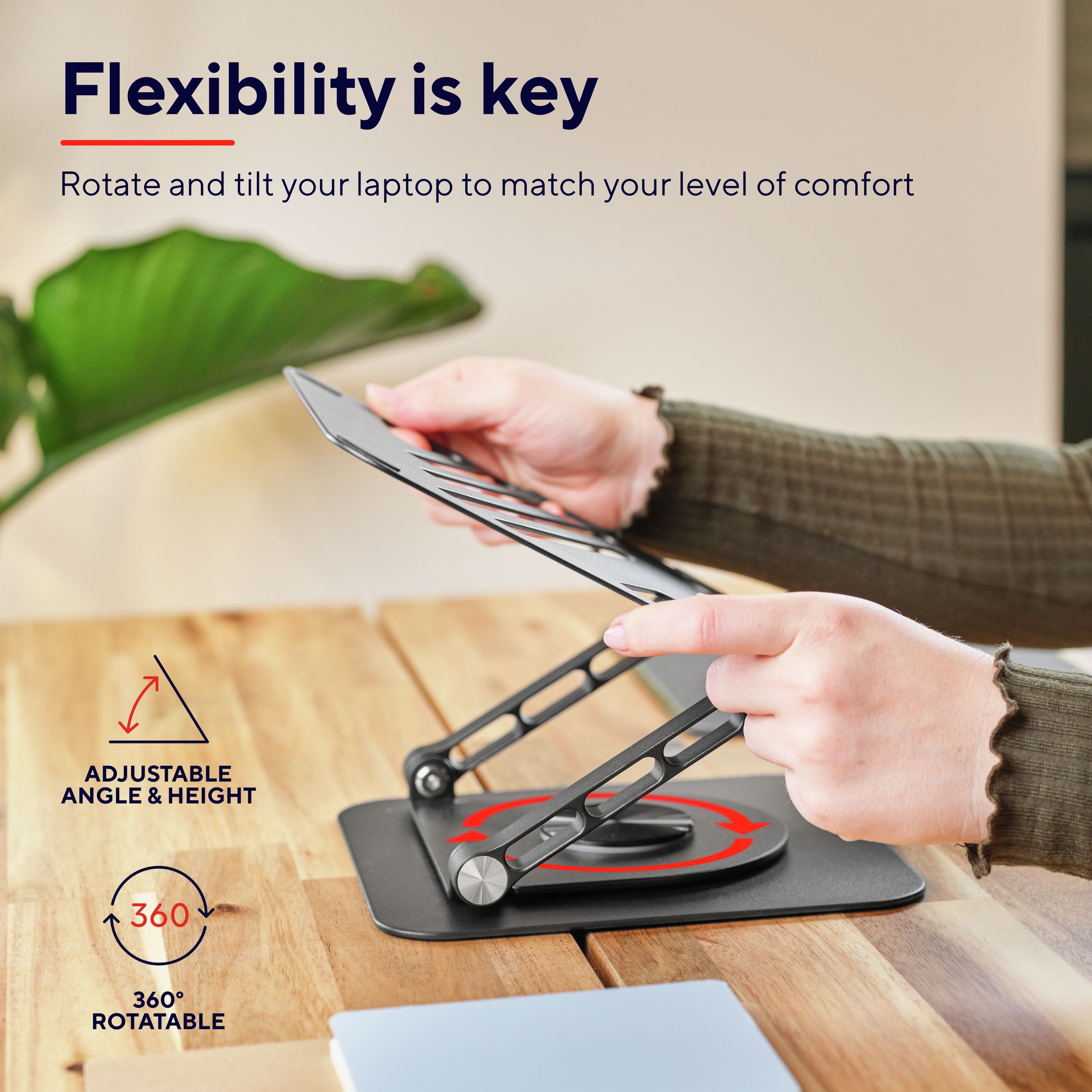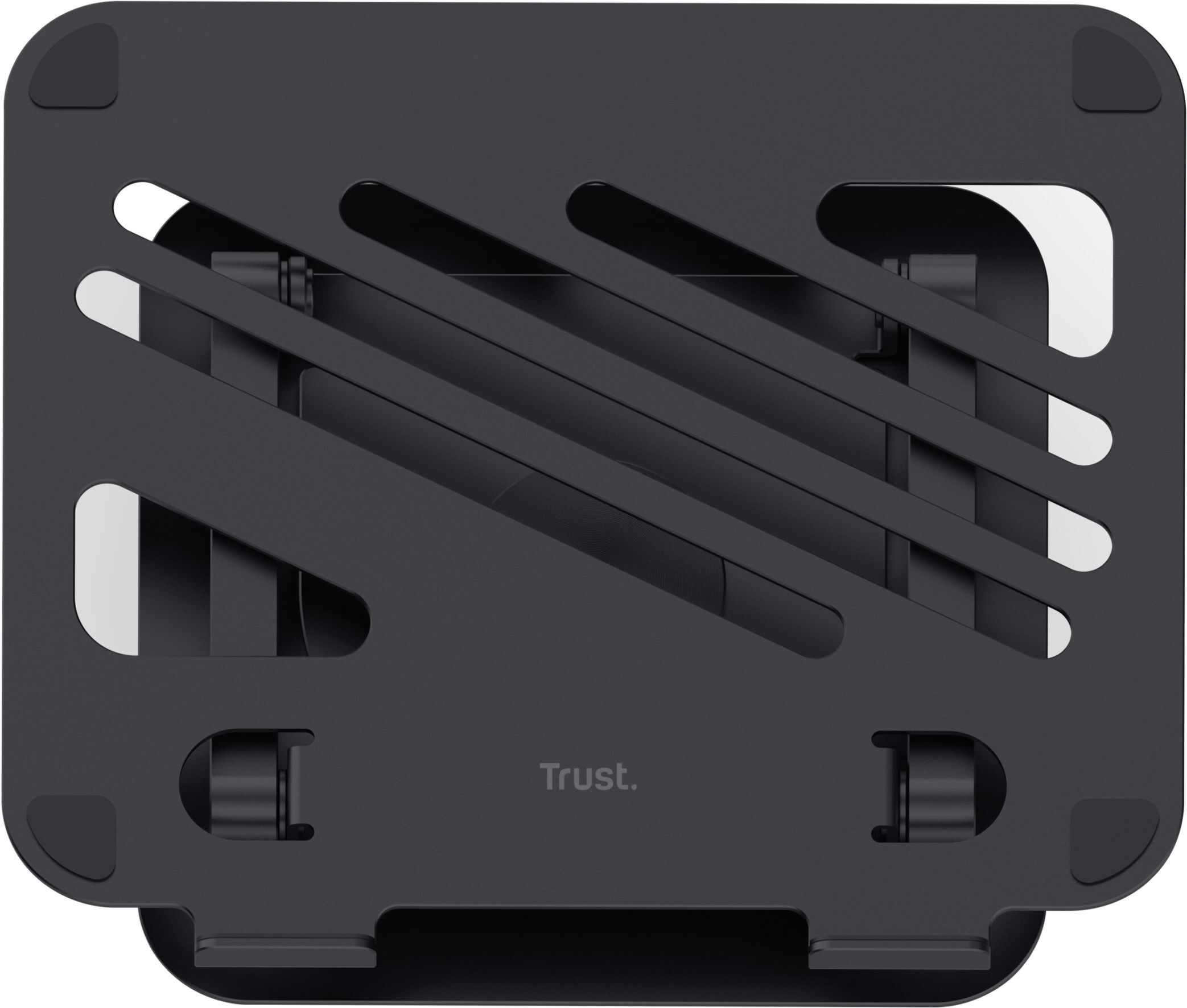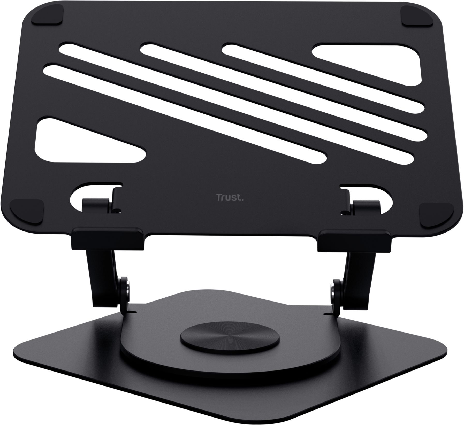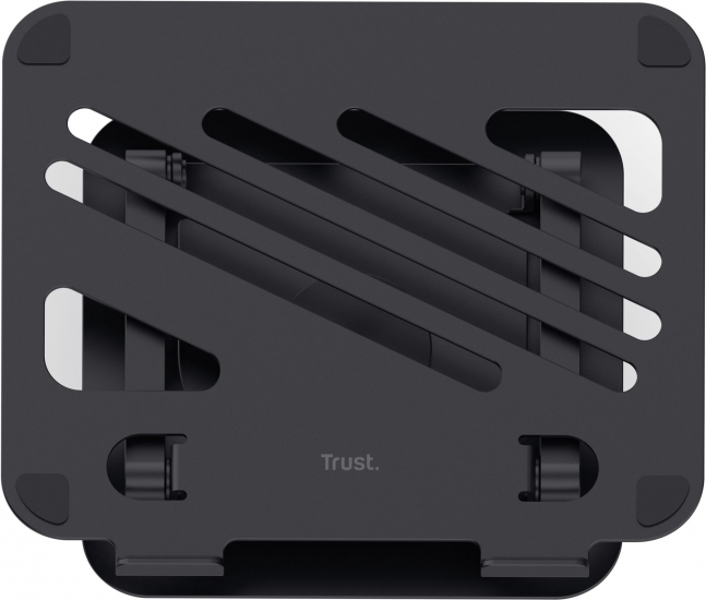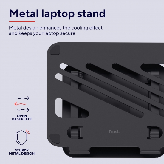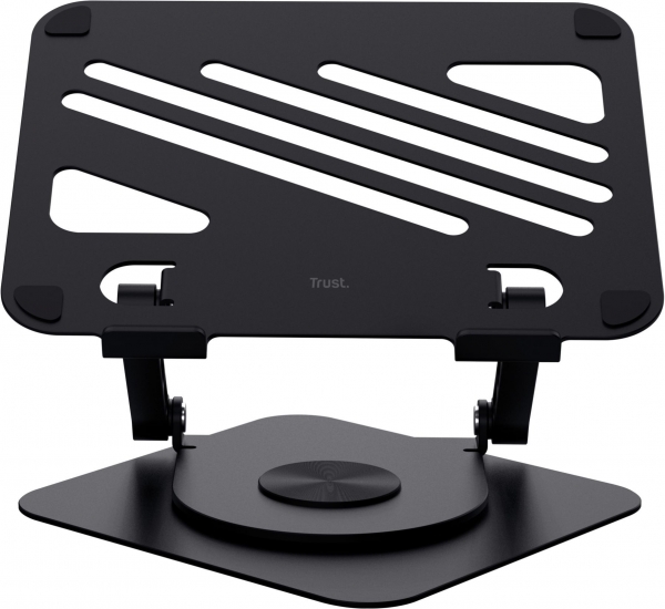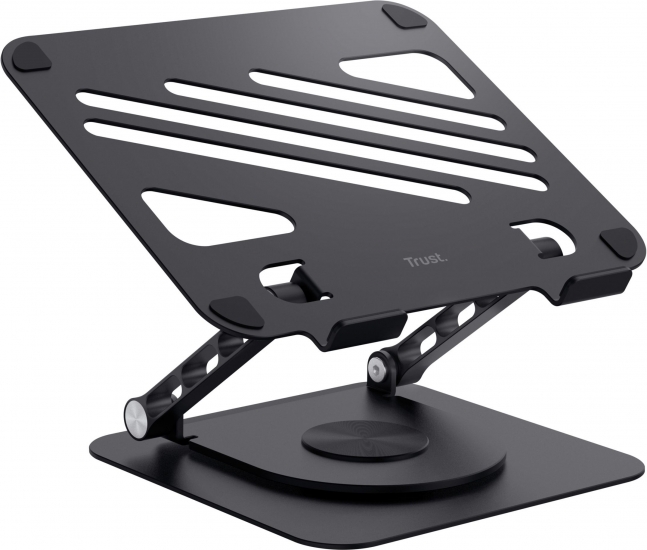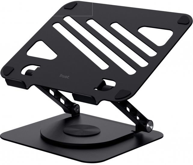 Trust Zeff Metal — складна підставка з металу вагою близько 1,84 кг. Вона підтримує ноутбуки вагою до 10 кг і розміром до 16 дюймів. Конструкція дозволяє регулювати висоту до ~17 см та нахил плавно, без фіксованих позицій, завдяки металевим шарнірам. Поворотна основа на 360° дозволяє зручно показати екран іншій людині або оптимізувати позицію для роботи