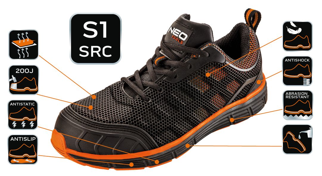 Опис Кросівки робочі Neo Tools, замш, ударопоглинання, сталевий підносок, S1P SRC, СЕ, р.40(26.7см), чорно-помаранчевий
