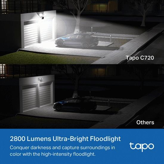 Потужний, повністю регульований прожектор камери Tapo C720 проникає в темряву на глибину 30 метрів, а кольорове нічне бачення забезпечує детальне спостереження, гарантуючи вам спокій протягом всієї ночі.