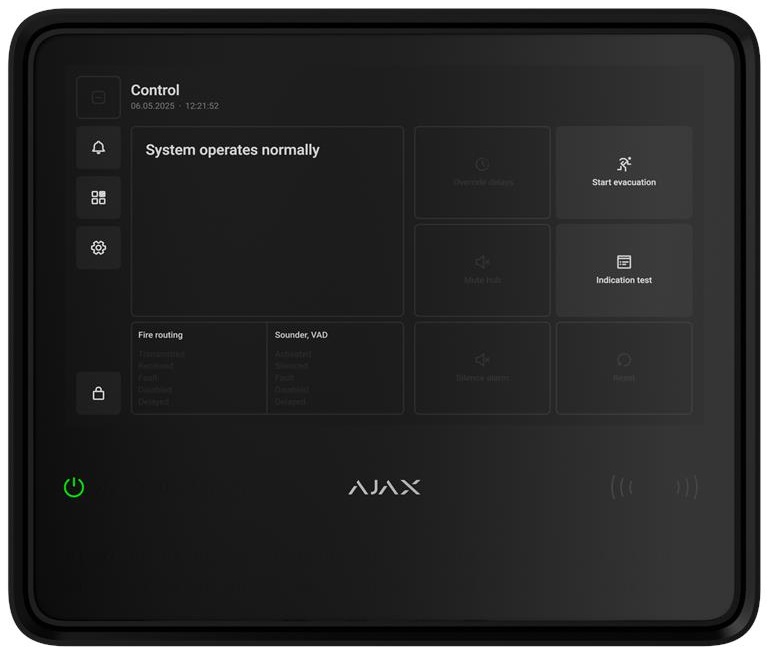 EN54 Fire Hub оснащена резервним живленням, яке забезпечує автономну роботу системи на термін до 24 або 72 годин (залежно від встановленої акумуляторної батареї). Вбудовані сирена та LED-індикація сигналізують про тривогу, несправності або відключення зон, а всі сповіщення дублюються через мобільний та десктоп додатки Ajax.