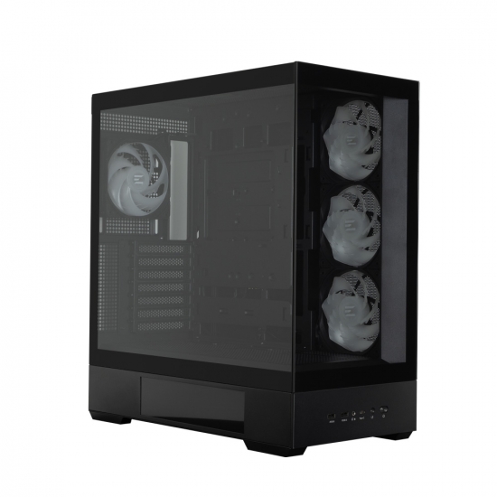 Передня та бічна панелі – загартоване скло зі зручним та практичним безгвинтовим кріпленням. Прозорий панорамний корпус підкреслює візуальний ефект вентиляторів ARGB і виглядає стильно.