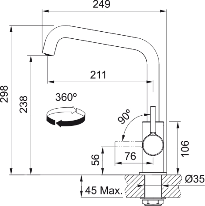 Опис Змішувач для кухні Franke Lina U, довж.виливу - 211мм, поворотний, 1важіль, хром