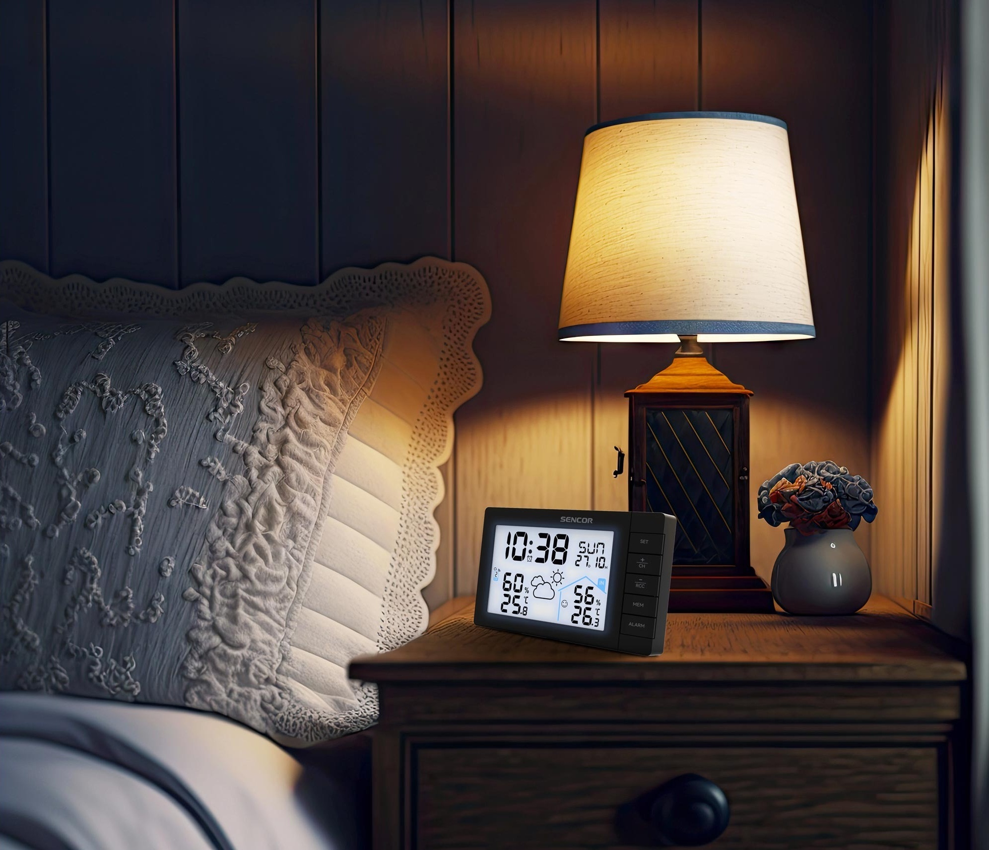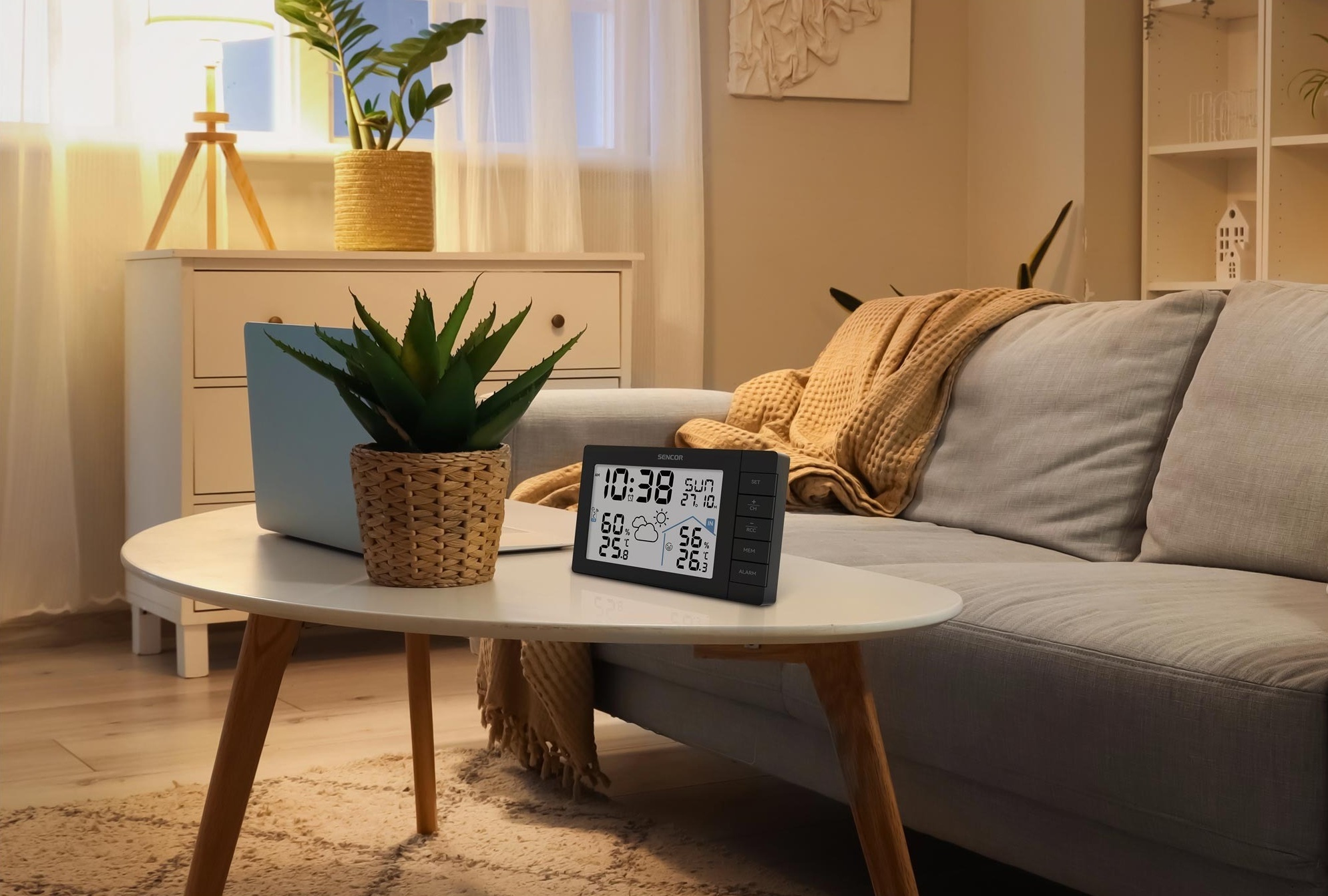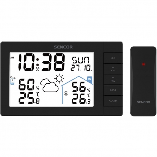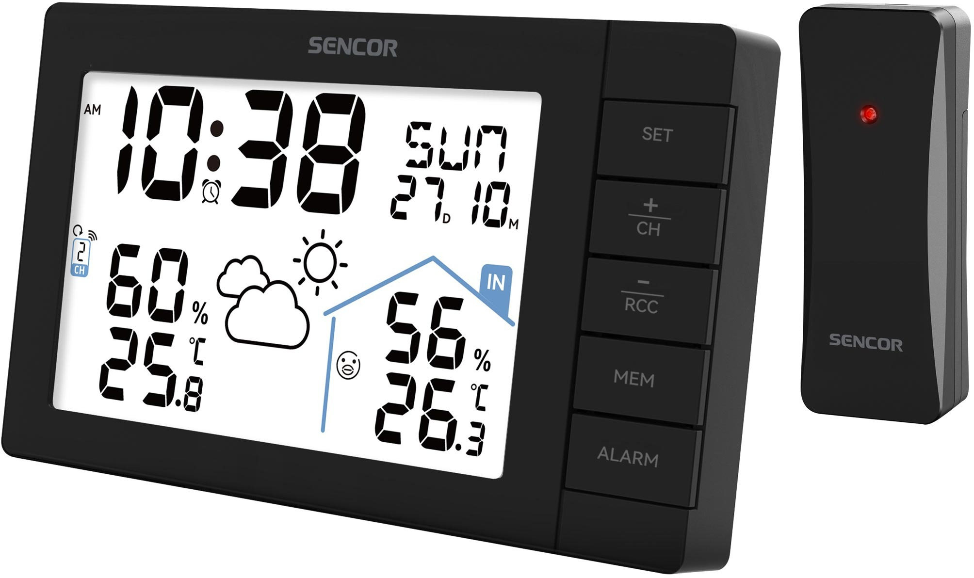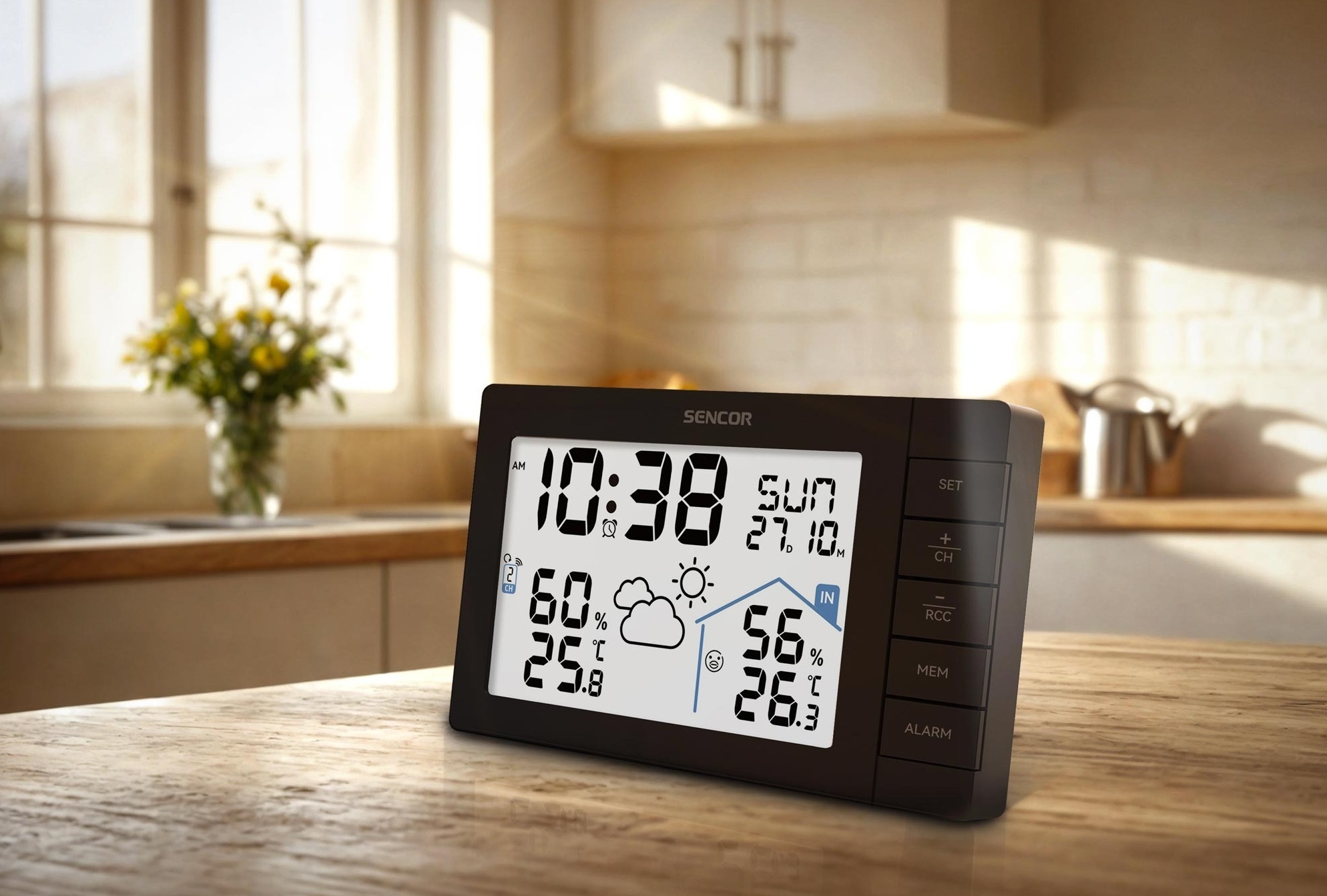 Метеостанція Sencor SWS3200 контролює температуру як у приміщенні, так і на вулиці. Дисплей температури з можливістю вибору °C/°F, а також рівень вологості у відсотках.