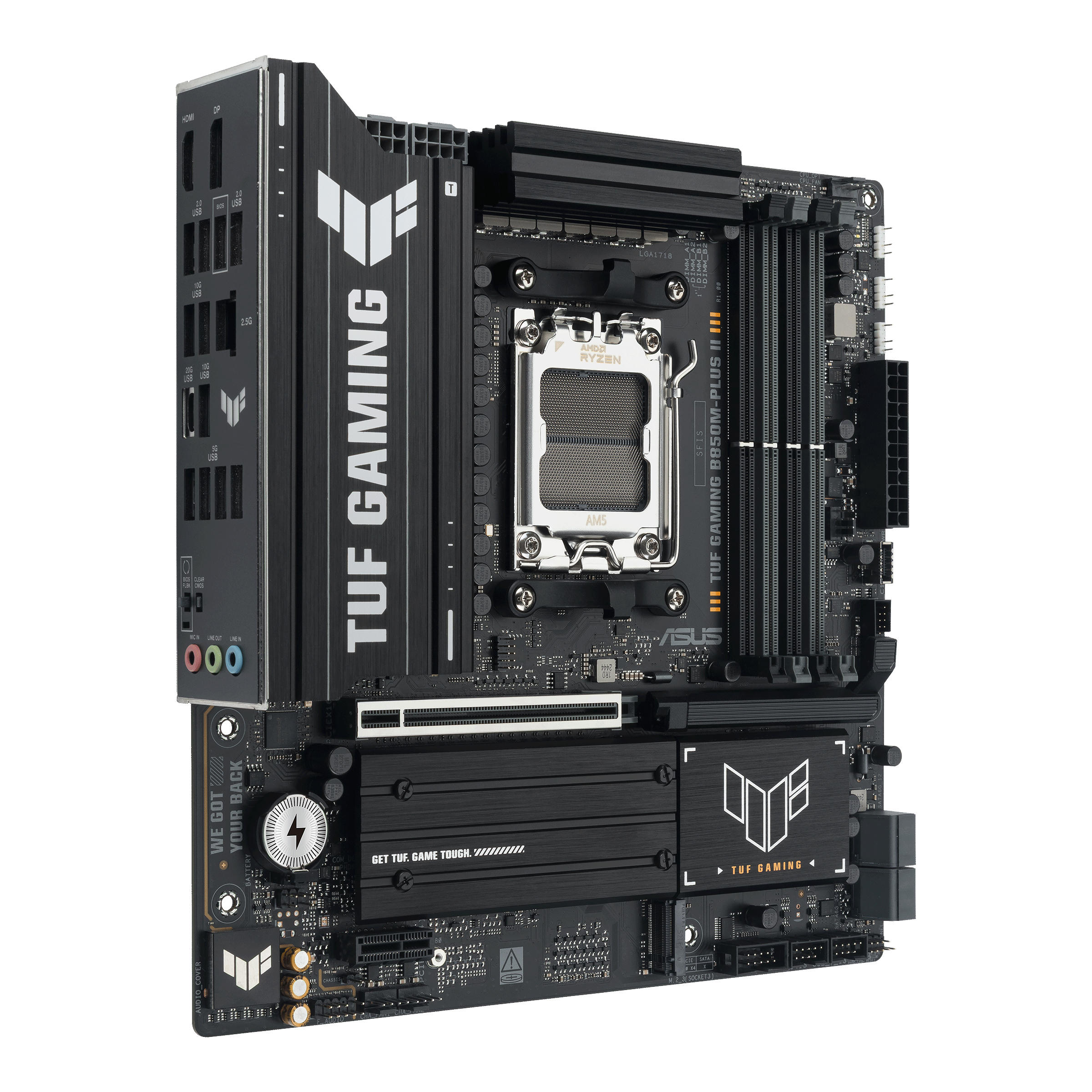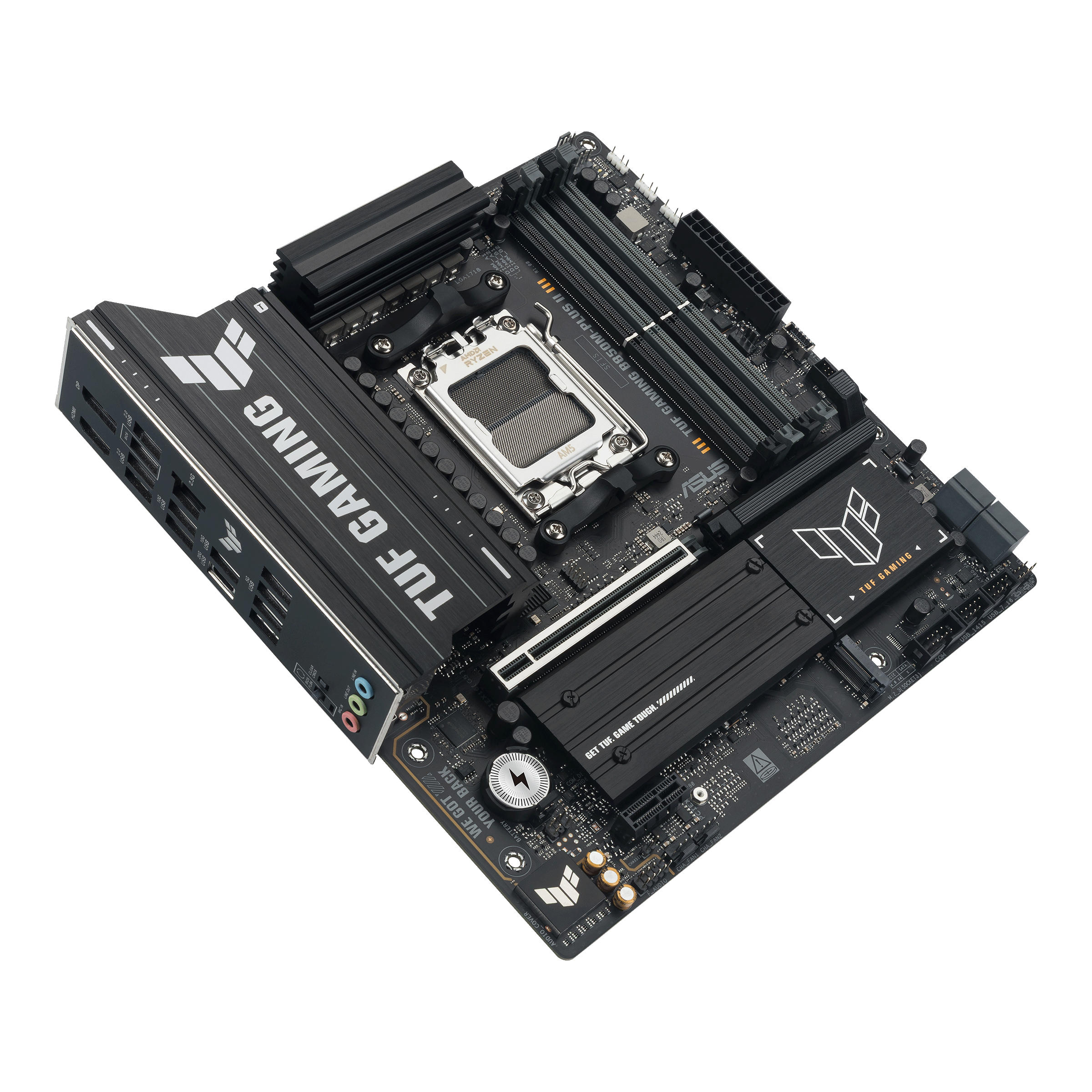 ASUS TUF GAMING B850M-PLUS II поєднує в собі всі найважливіші елементи новітніх процесорів AMD Ryzen з функціями, необхідними для ігор, та перевіреною надійністю. Створена з використанням компонентів військового класу, вдосконаленої системи живлення та комплексної системи охолодження, ця материнська плата перевершує всі очікування, забезпечуючи надійну та стабільну роботу під час тривалих ігрових сесій.
