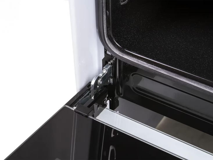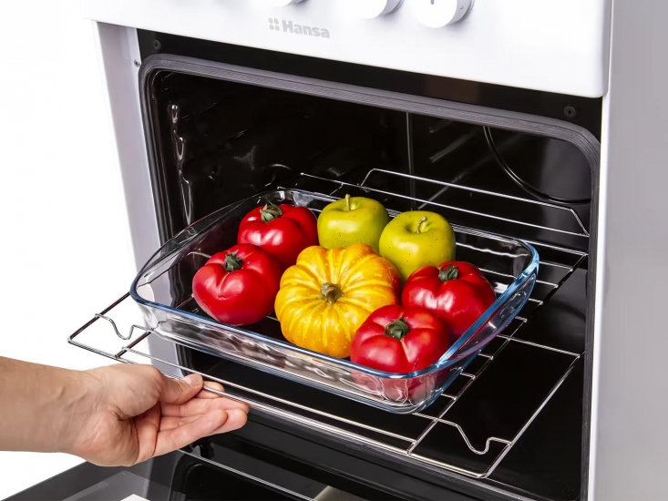 Електрична плита Hansa FCEW53000 з духовкою об’ємом 69 л та трьома функціями приготування. Має емаль легкого очищення, підсвітку, рецепти на дверцятах, металеву кришку та висувний ящик для посуду.