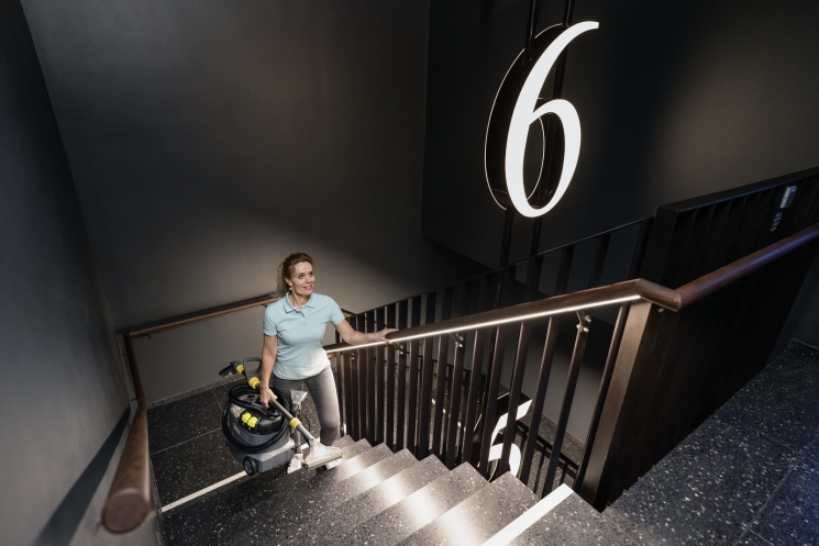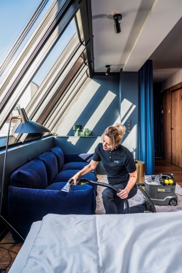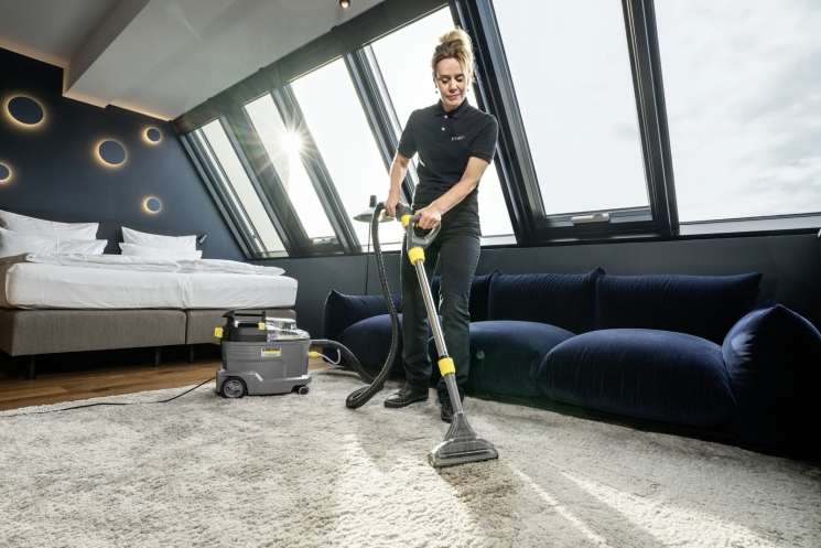 Немає необхідності нахилятися: увімкнення та вимкнення апарата завдяки ножному перемикачу. Одностадійний метод швидкого прибирання: розпилення та всмоктування в одному робочому процесі. Двостадійний метод: обробка волокон миючим розчином, витримування часу дії з подальшим збором вологи.