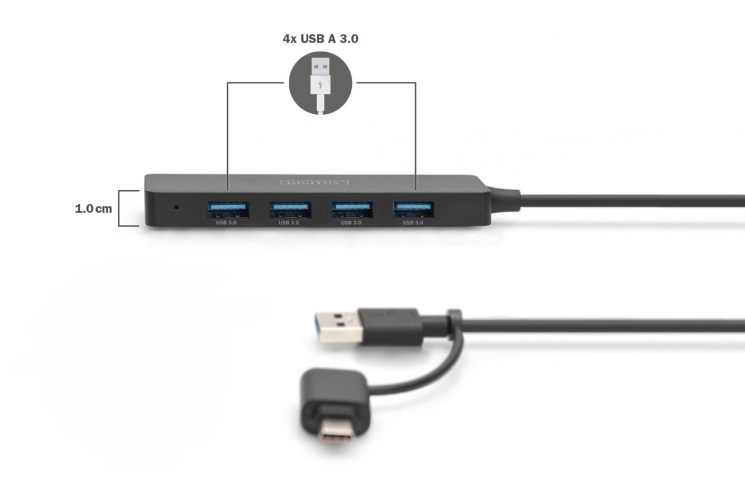 Концентратор DIGITUS USB 3.0 Hub Slim Line є зручним розширенням для будь-якого робочого місця. До чотирьох пристроїв USB можна підключити та використовувати одночасно, що полегшує використання кількох пристроїв введення або портативних пристроїв зберігання даних.