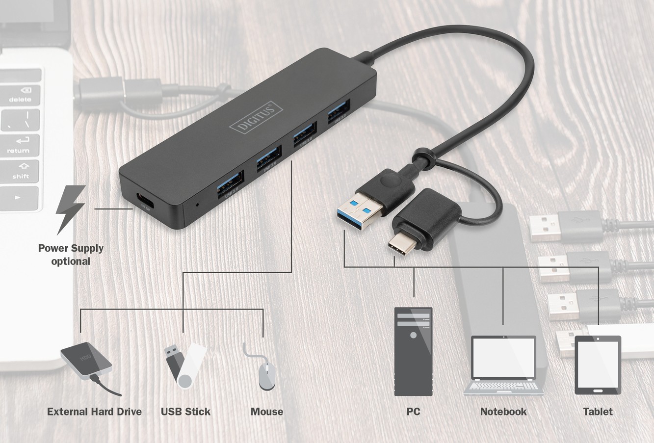 Хаб DIGITUS USB-A/C > 4хUSB-А, 0,2 м, активний (опція)
