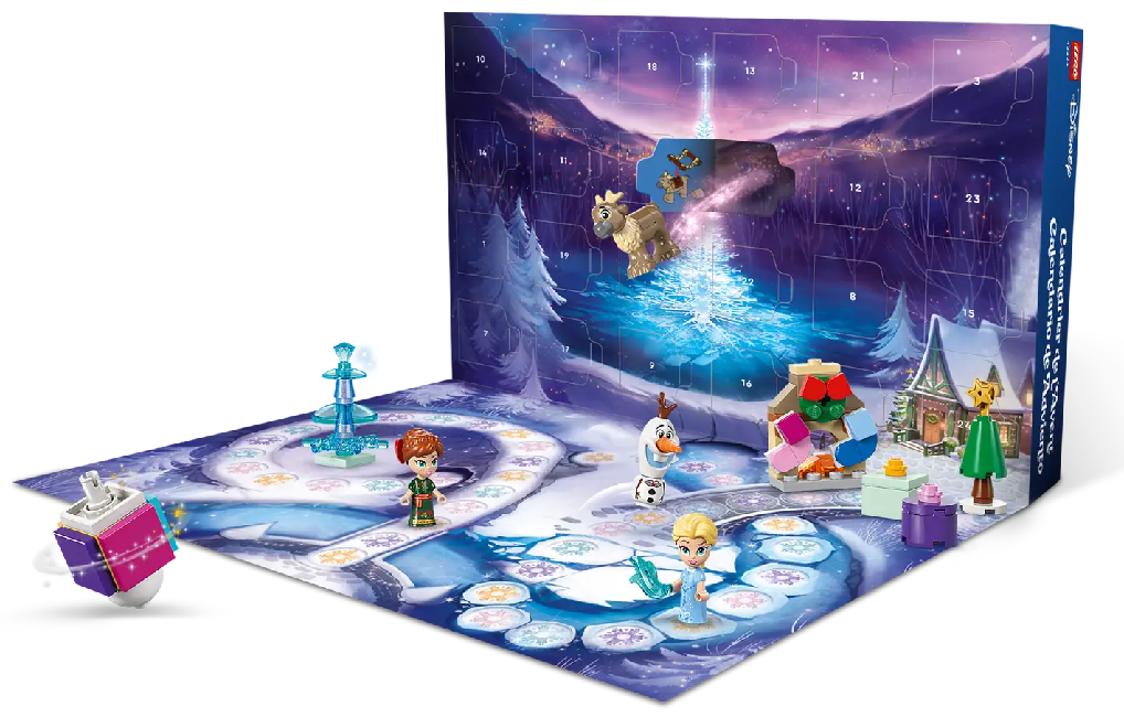 Персонажі Disney та інше – у календарі є Елза, Анна, Крістофф, Олаф і Свен LEGO® ǀ Disney, 2 кошеняти LEGO® ǀ Disney, міні-замок Аренделл і крижане дерево.