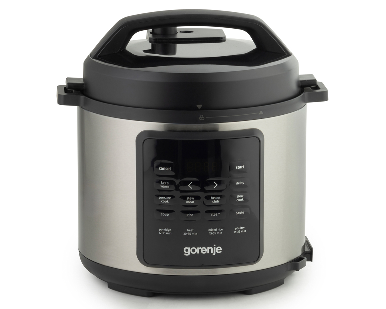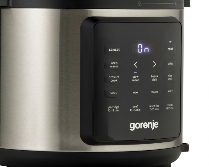 Опис Мультиварка-скороварка Gorenje, 1000Вт, чаша-6л, електронне керув., 8 програм, метал/пластик, чорний-нерж
