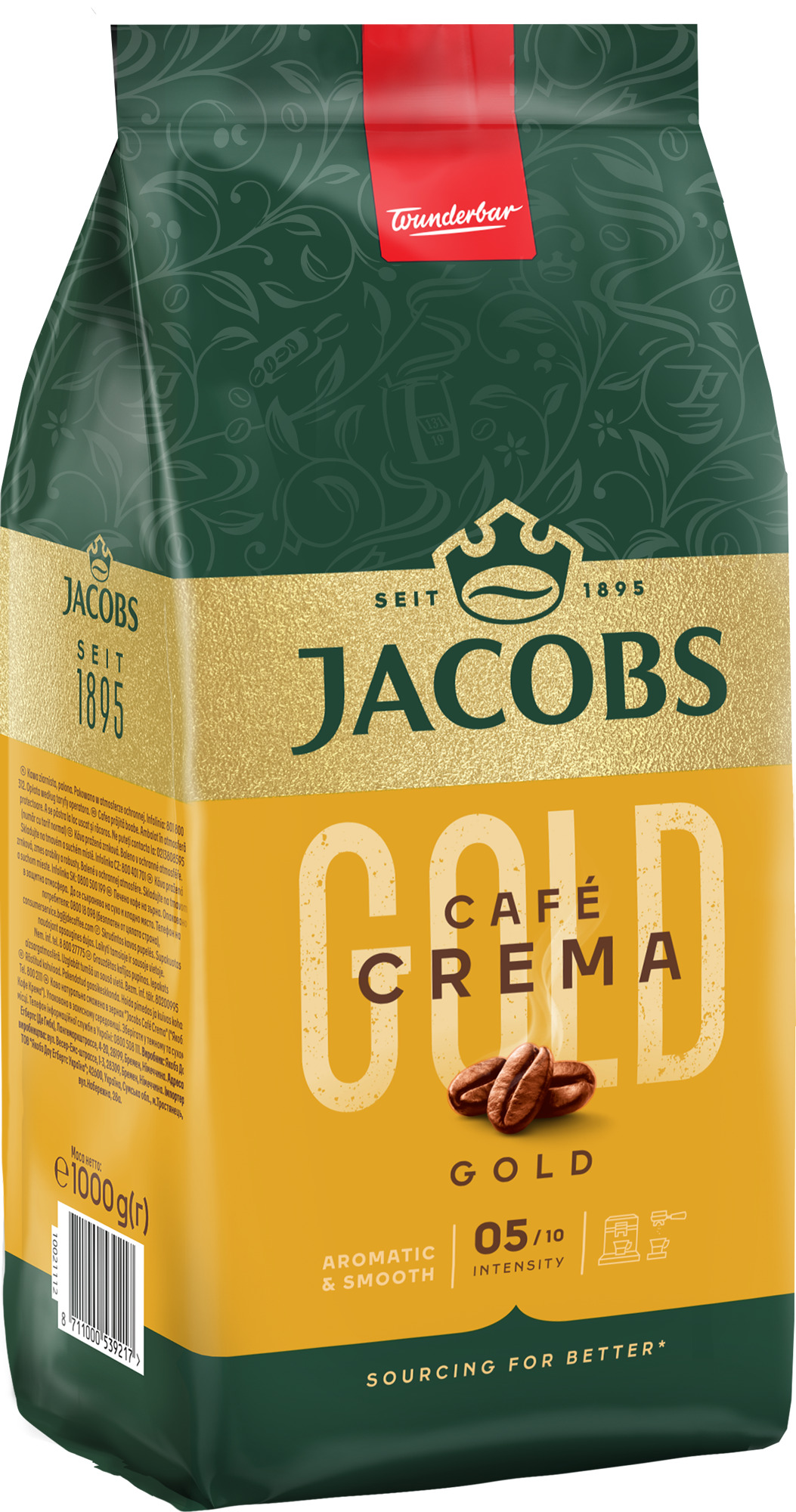 Jacobs Crema Gold — кава в зернах, купаж арабіки та робусти з м’яким збалансованим смаком і ніжною пінкою crema. Упаковка: 1000 г.