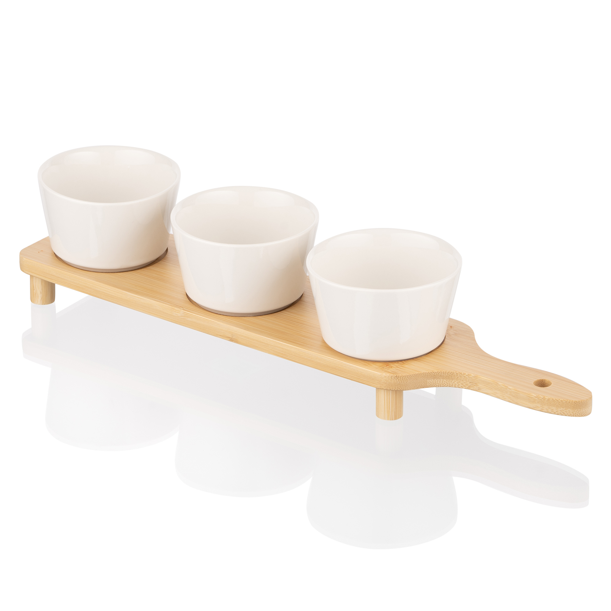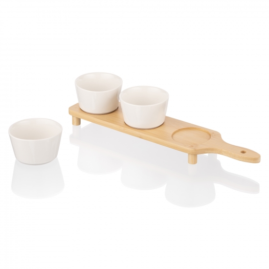 Набір соусників ARDESTO серії Midori – витончене та практичне рішення для сервірування чи не будь-якого стилю. У наборі є три соусники білого кольору об’ємом 110 мл і підставка, яку виготовлено з бамбука. Вироби гармонійно поєднуються між собою, створюючи привабливий вигляд і додаючи сервіруванню особливого шарму. Посуд виготовлено з якісної порцеляни, міцної та стійкої до утворення сколів і тріщин, що зумовлює тривалий термін слугування. Вироби можна використовувати в мікрохвильовій печі та мити в посудомийній машині (крім підставки). Набір стане в пригоді не лише для щоденних трапез, а і для особливих подій.