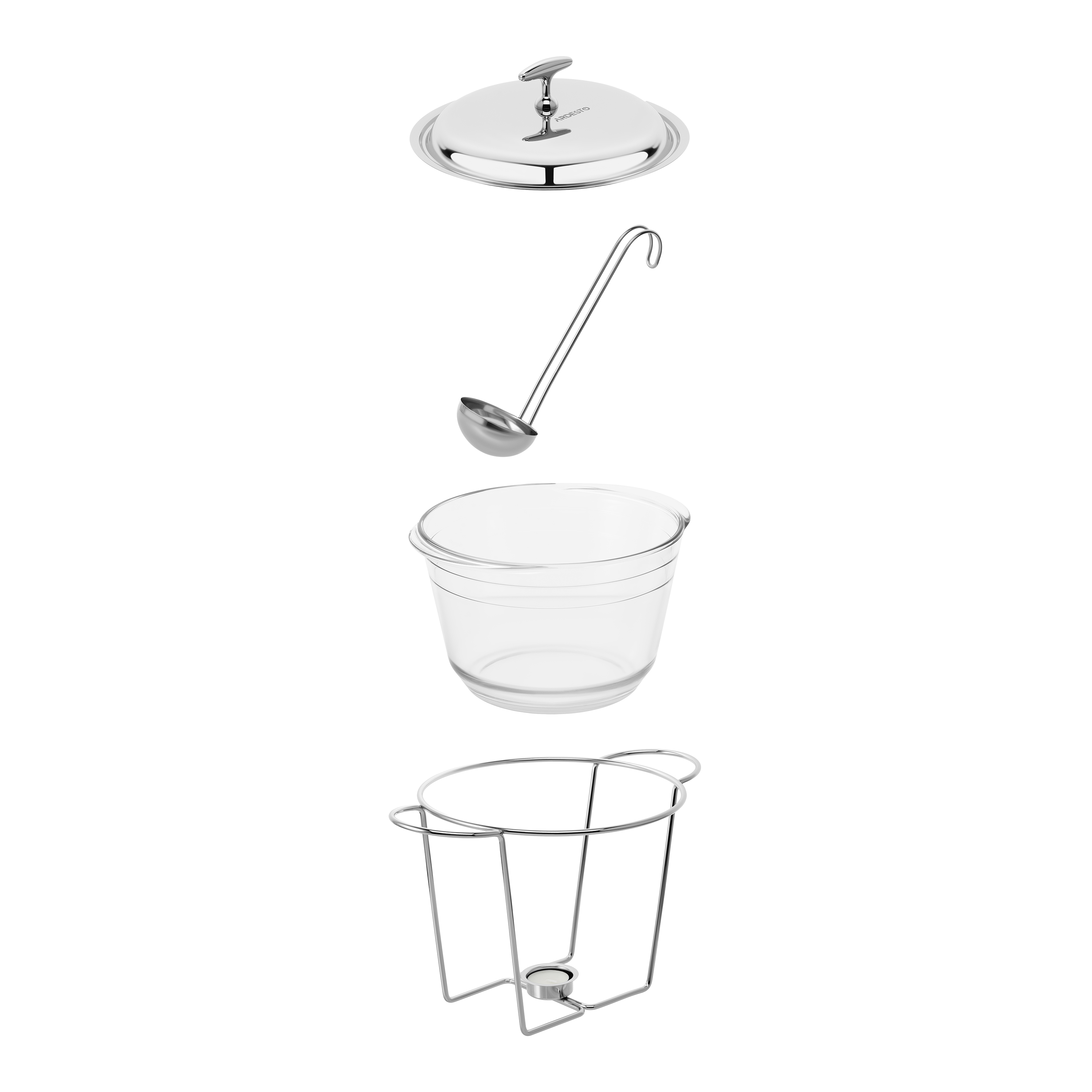 Круглий марміт об’ємом 3,8 л – це елегантне поєднання функціональності та стилю, створене для зручного сервірування гарячих страв. Ємність виготовлено з термостійкого боросилікатного скла, яке витримує температури від -40 до +400 °C, даючи змогу використовувати її в мікрохвильовій печі та духовці. Прозорий колір додає вишуканості, а кришка, підставка та ополоник із нержавіючої сталі забезпечують довговічність і зручність щодо користування. У комплекті також передбачено свічку для підтримання тепла, а всі елементи можна мити в посудомийній машині, що робить догляд максимально простим.