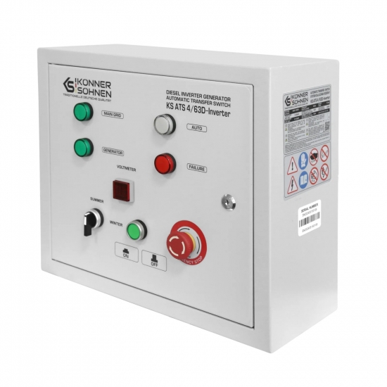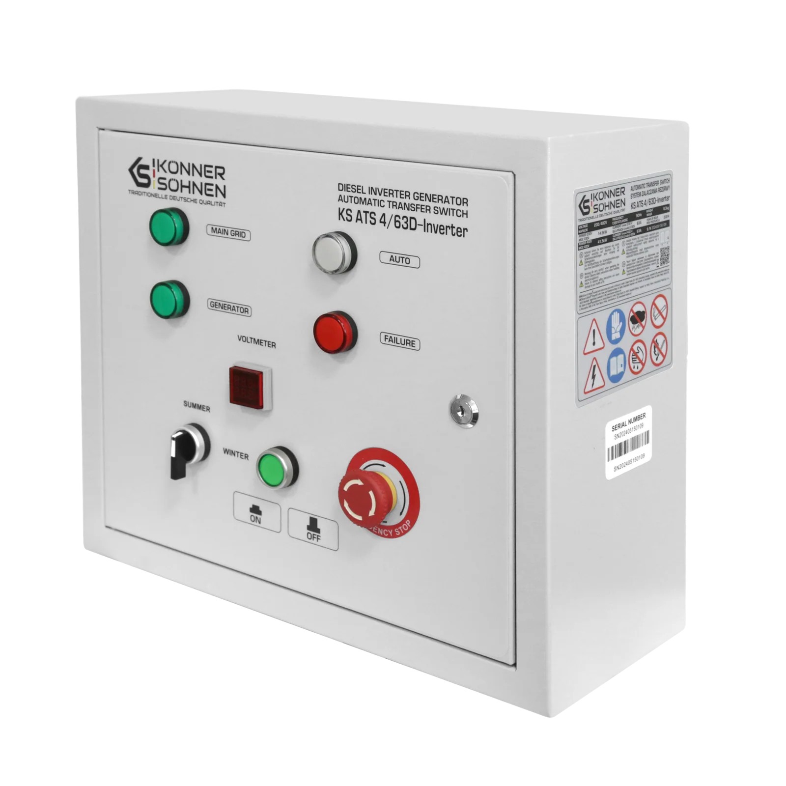 Модель блоку АВР KS ATS 4/63D-Inverter підходить для дизельних інверторних генераторів «Könner&Söhnen» KS 6100iDE ATSR та KS 9500iDE ATSR.