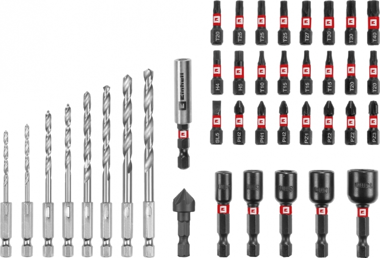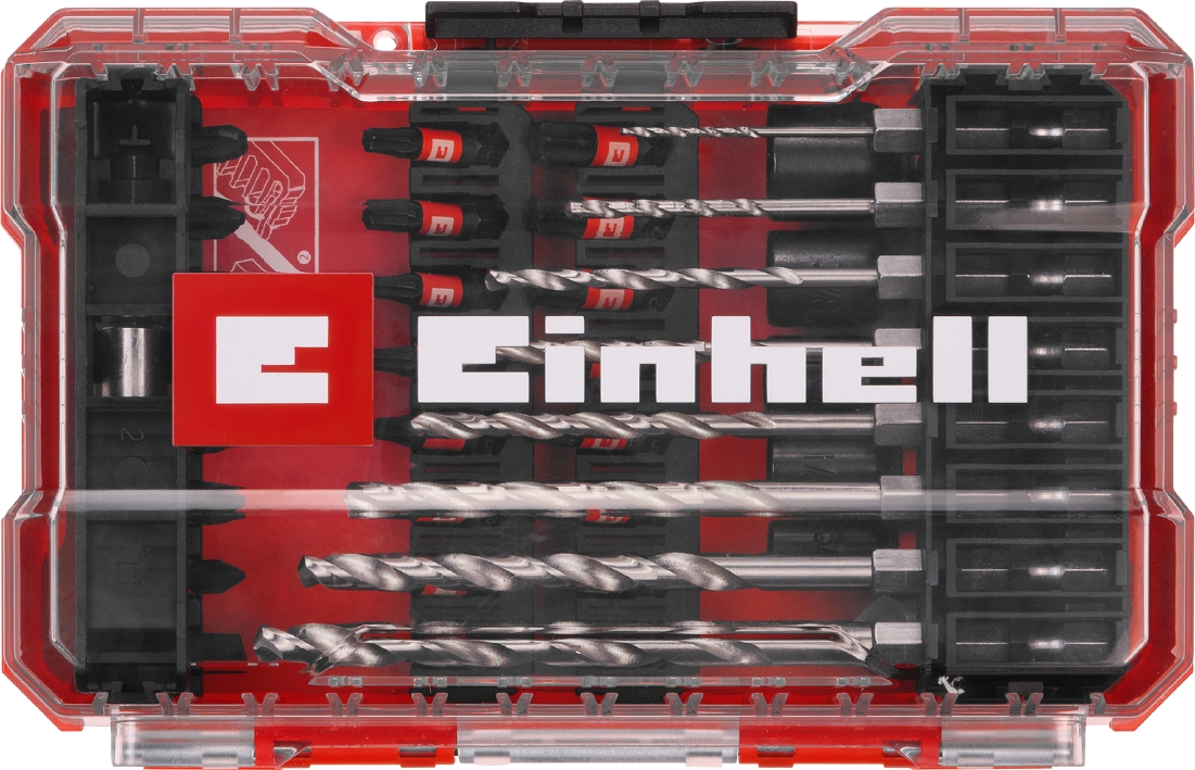 M-Case від Einhell, що складається з 39 предметів, поєднує в собі свердла по металу, ударостійкі біти, головки, тримач насадок і зенкери в наборі, який оптимально адаптований до потреб професіоналів і майстрів DIY. 24 біти довжиною 25 мм і шліцем PH1/2xPH2/PZ1/2xPZ2/PZ3/T10/3xT15/3xT20/3xT25/T27/2xT30/T40/SL5/H4/H5 виготовлені зі стійкої фосфатованої марганцем сталі S2 і мають хвостовик C 6.3. Вони спеціально розроблені для тривалого терміну служби в складних умовах роботи.