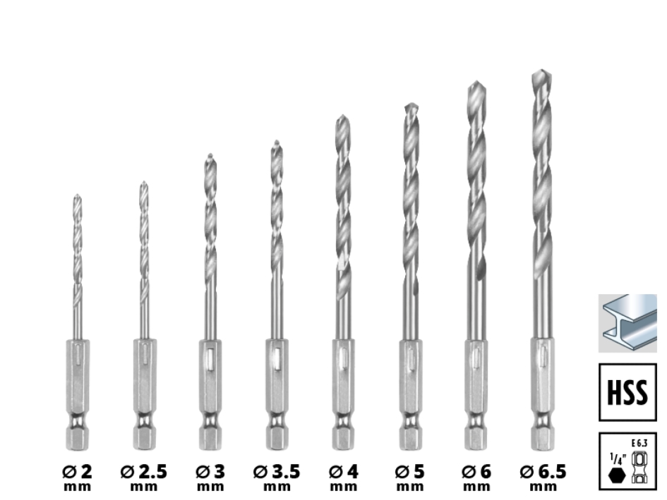 - 8 свердл по металу (2-6,5 мм) зі сталі HSS 4241 з хвостовиком E 6.3, спіраль типу N, кут 135°