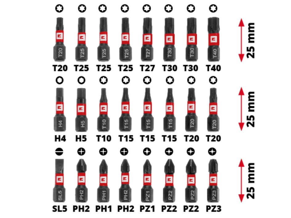 - 24 ударостійкі біти (25 мм) з хвостовиком C 6.3, S2