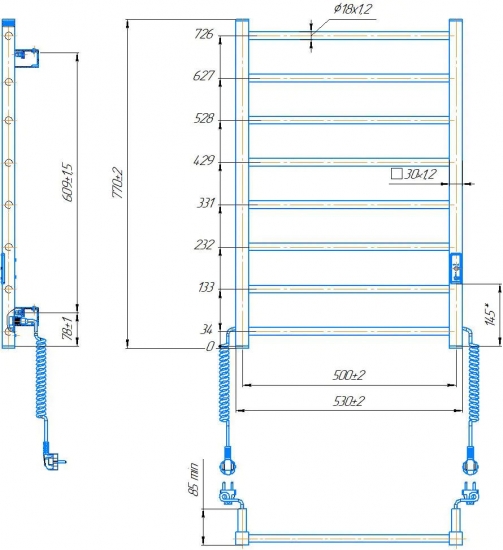 Електрична рушникосушарка HF Leeds 770×530. Працює за технологією сухого ТЕНу. Обладнана вбудованим таймер-регулятором і конектором для підключення до живлення з будь-якого боку.